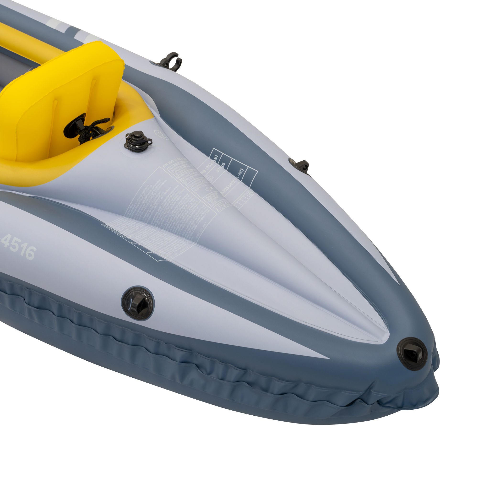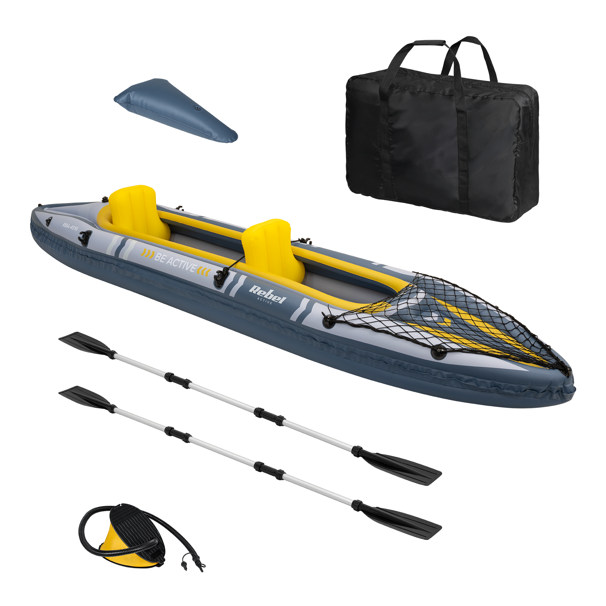 W zestawie: 2 x wiosło, 2 x oparcie, 1 x pompowany podnóżek, pompka nożna, torba do przenoszenia, miarka, łatka naprawcza