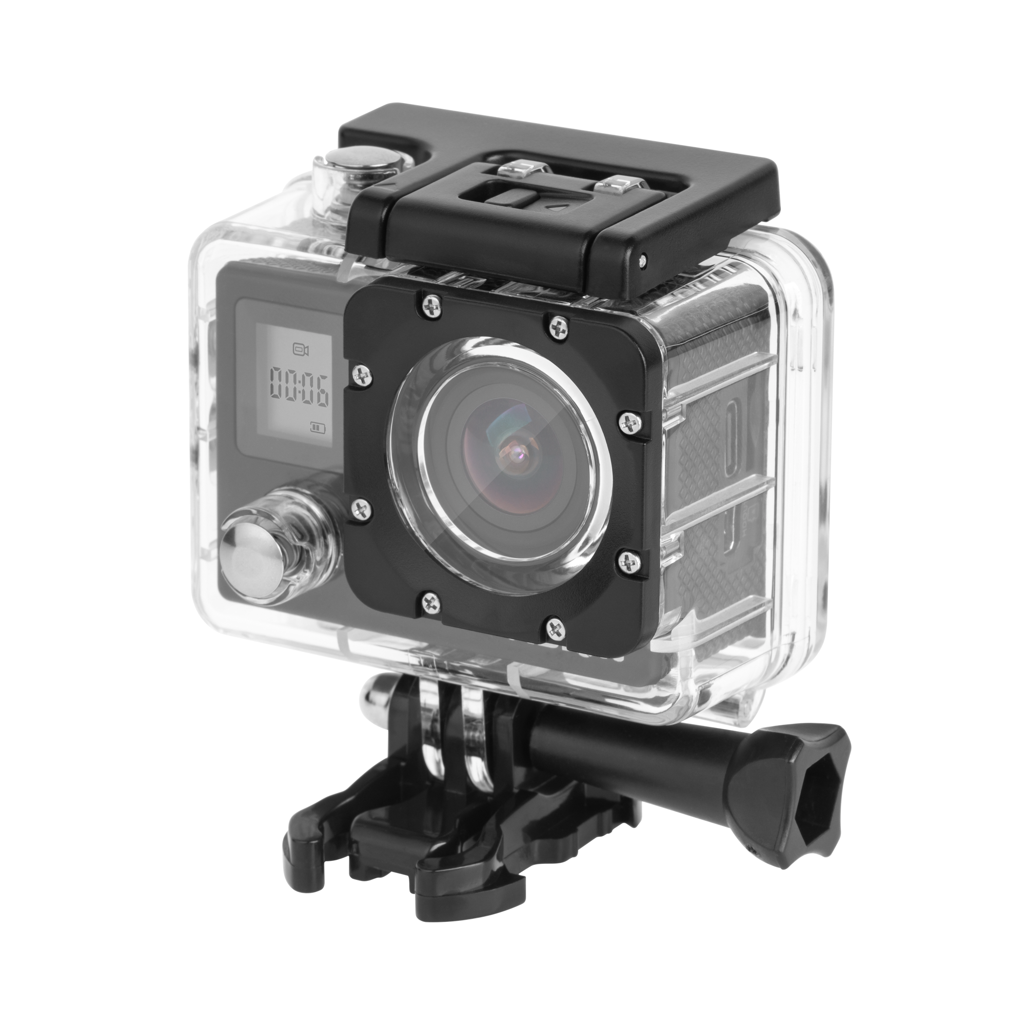Akcesoria: Wymienny panel obudowy, uchwyt rowerowy, ramka z klipsem, 2x wsuwka do mocowania z taśmą, 2x krótkie złącza, 1x długie złącze, głowica, 2x pasek z rzepem, 2x pasek z zatrzaskiem, 2x taśma montażowa, linka zabezpieczająca, 4x opaska zaciskowa, ściereczka