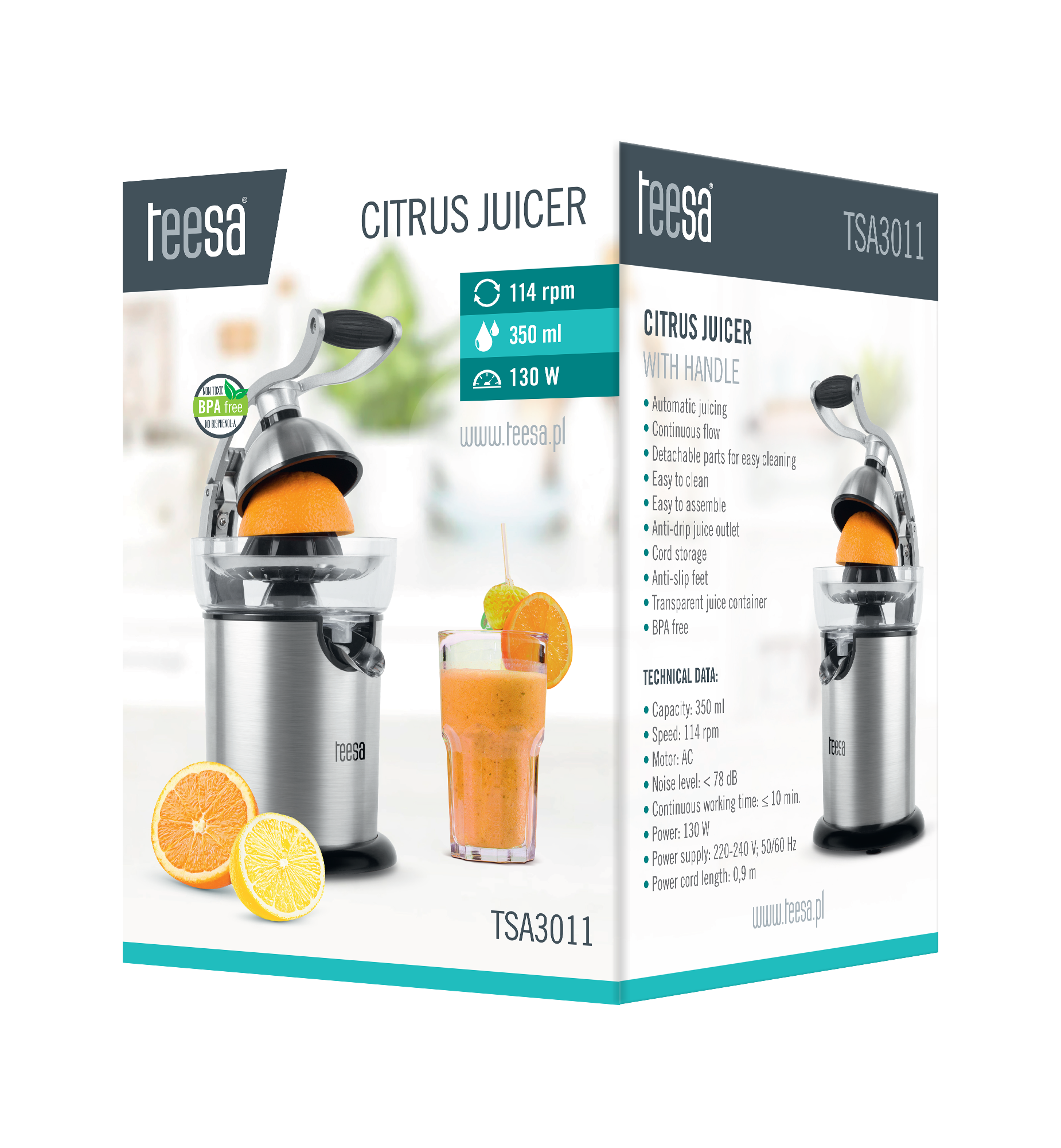 -------- Pagrindinės funkcijos -------- Automatinis spaudimas Nuolatinis sulčių srautas Šalintos valymo dalys dalį galima plauti indaplovėje (kūgio / dygsnio / sulčių bakas) Easy- valyti Easy- to-clean Outflow su dreifuoti nepralaidus saugojimo skyrius kabelis Neslystančios pėdos Skaidri zona sulčių bakas nemokamai BPA ------ Panaudotos medžiagos Ekstrahavimas: Nerūdijančio plieno korpuso / kūgio / dygsnio dangtelis: Nerūdijančio plieno + ABS Rankena: Aliuminio sultys bakas: AS -------- techniniai parametrai Na... Talpa: 350 ml greitis: 114 apsisukimų per minutę Variklis: AC garso lygis: nuolatinis veikimas: = galia: 130 W maitinimo šaltinis: 220-240 V; 50 / 60 Hz Maitinimo laido ilgis: 0.9 m