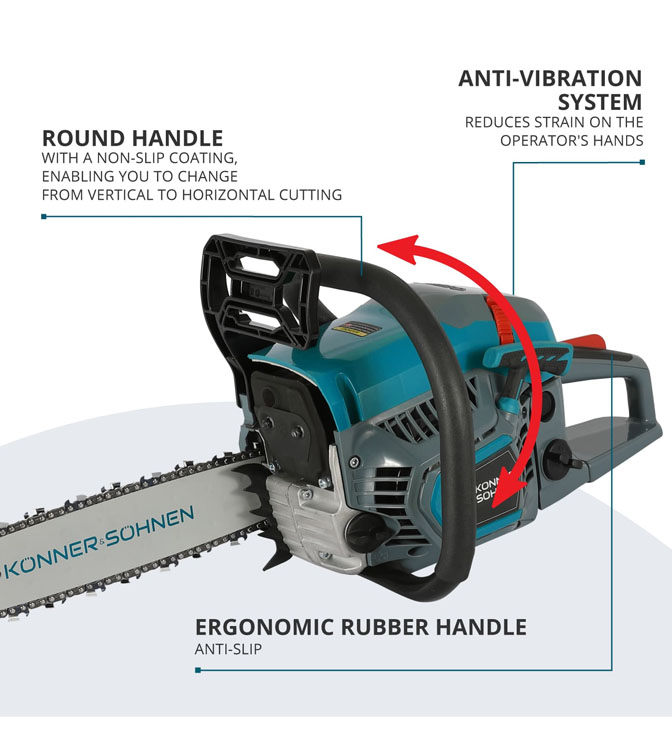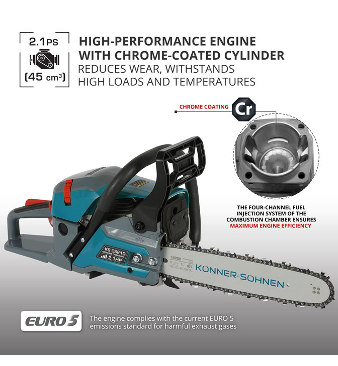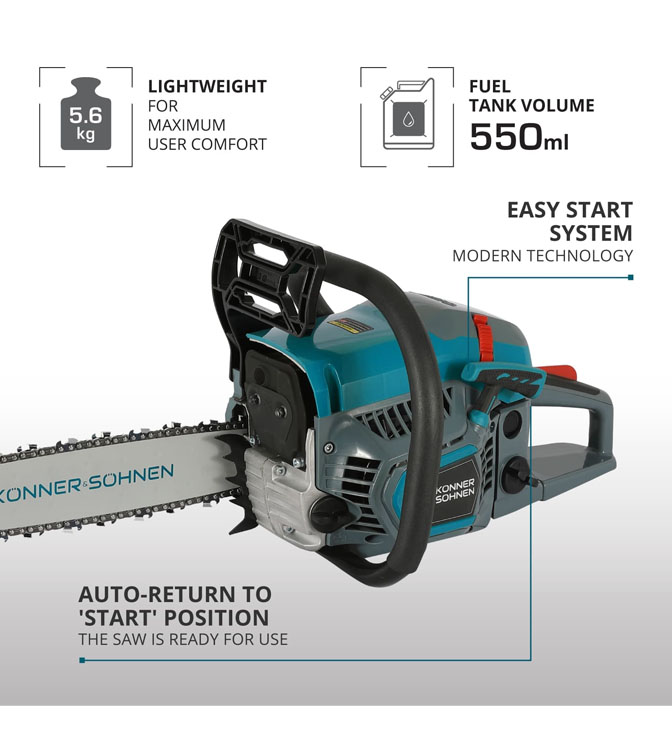 Benzininis grandininis pjūklas „Könner & Söhnen® KS CS21G“ - tai namų įrankis, kuris ne tik greitai atlieka darbą, bet ir užtikrina naudotojo komfortą bei saugumą. Šis tvirtas ir galingas grandininis pjūklas tinka tiek statybos darbams, tiek sodo priežiūros darbams, pavyzdžiui, medžių pjovimui ir šakų genėjimui.
