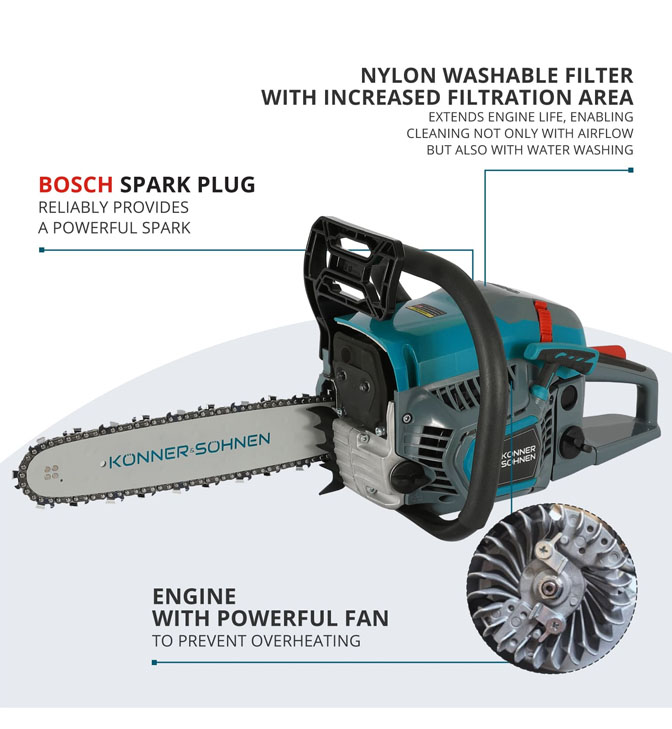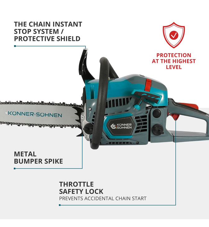 Bendrovė „Könner & Söhnen®“ skiria daug dėmesio saugumui, todėl grandininiai pjūklai turi patikimą grandinės gaudyklę, stabdančią grandinės atsitrenkimą, ir inercinį stabdį, kuris greitai sustabdo grandinę netikėtomis sąlygomis. Taip pat yra droselinės sklendės užraktas, apsaugantis įrankį nuo atsitiktinio įjungimo.