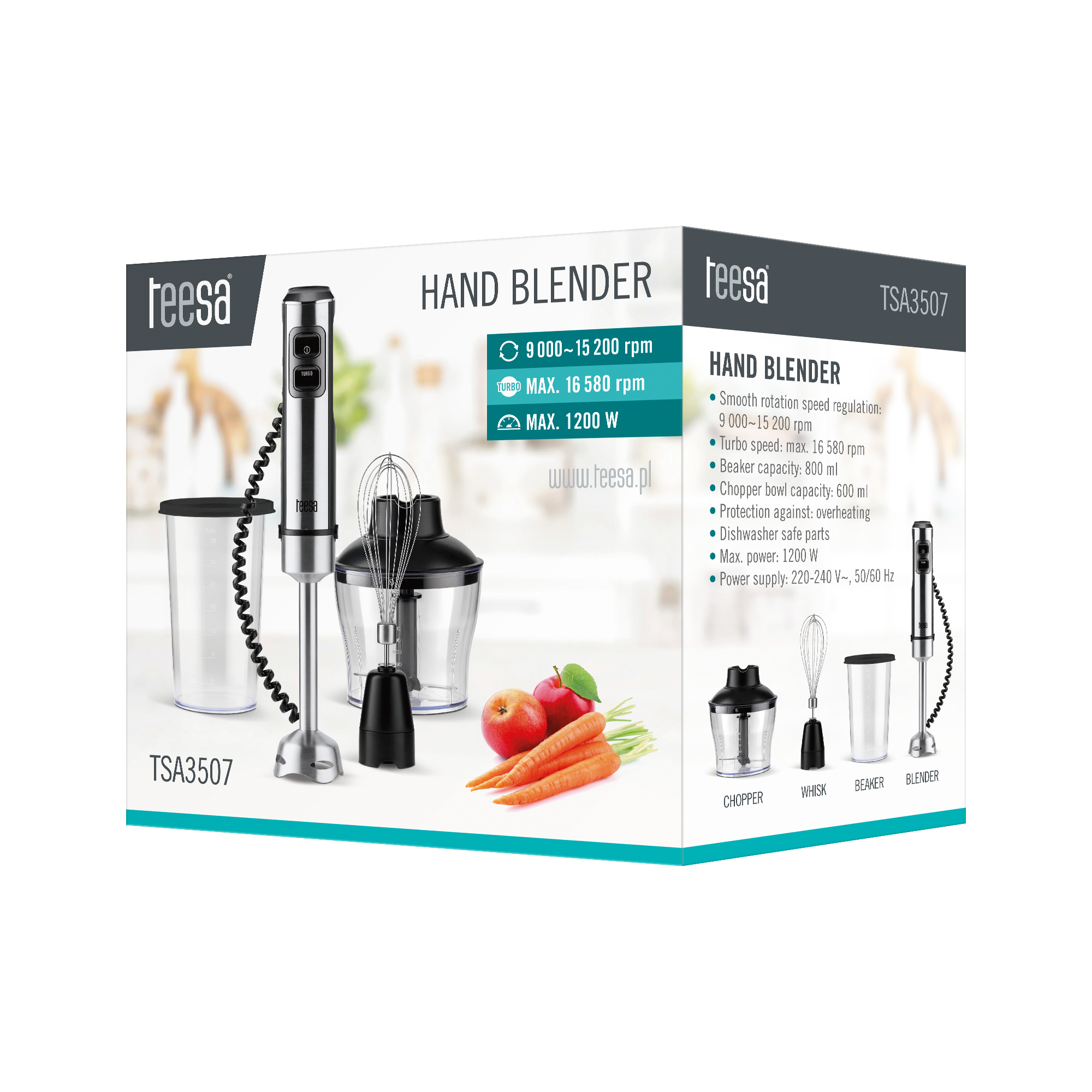 W zestawie: blender ręczny, rozdrabniacz, trzepaczka, dzbanek