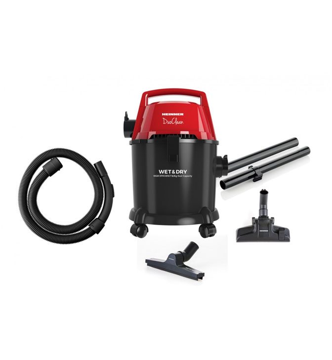 Sauso bei drėgno valymo, galingas dulkių siurblys ir namams ir garažui ar sodybai - HEINNER DuoClean HVC-MWD1400P-BK, galia 1400 W, sausas ir šlapias siurbimas, pūtimo funkcija, bako talpa: 15 l, tekstilinis maišas: 3 l, HEPA filtras, komplektuojami priedai: šepetys sausam siurbimui, 2-in-1 šepetys šlapiam ir sausam siurbimui, apvalus šepetys, siauras antgalis, ratukai.
