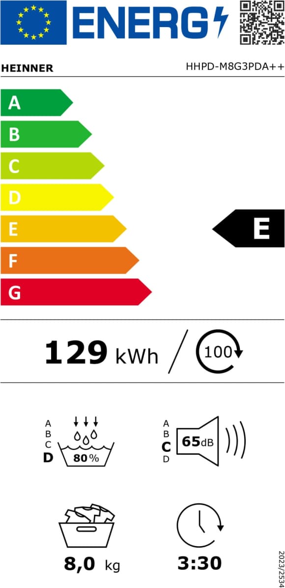 Džiovinimo mašina su šilumos siurbliu Heinner HHPD-M8G3PDA++, Talpa 8 kg, 16 programų, Energijos efektyvumo klasė E, LED ekranas, Atidėto paleidimo funkcija, Nuo susiglamžymo apsaugos funkcija, Būgno apšvietimas, Išmatavimai (P × G × A): 59.5 × 62.5 × 84.5 cm, Spalva: Balta.