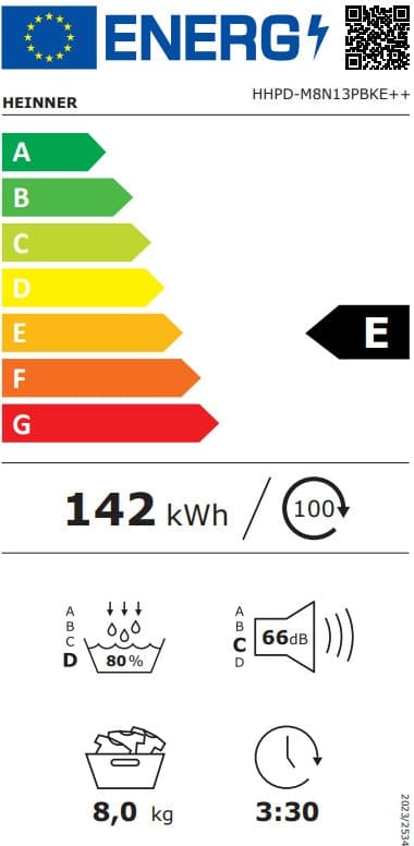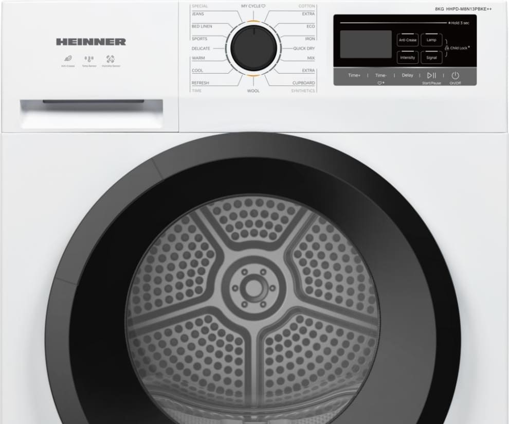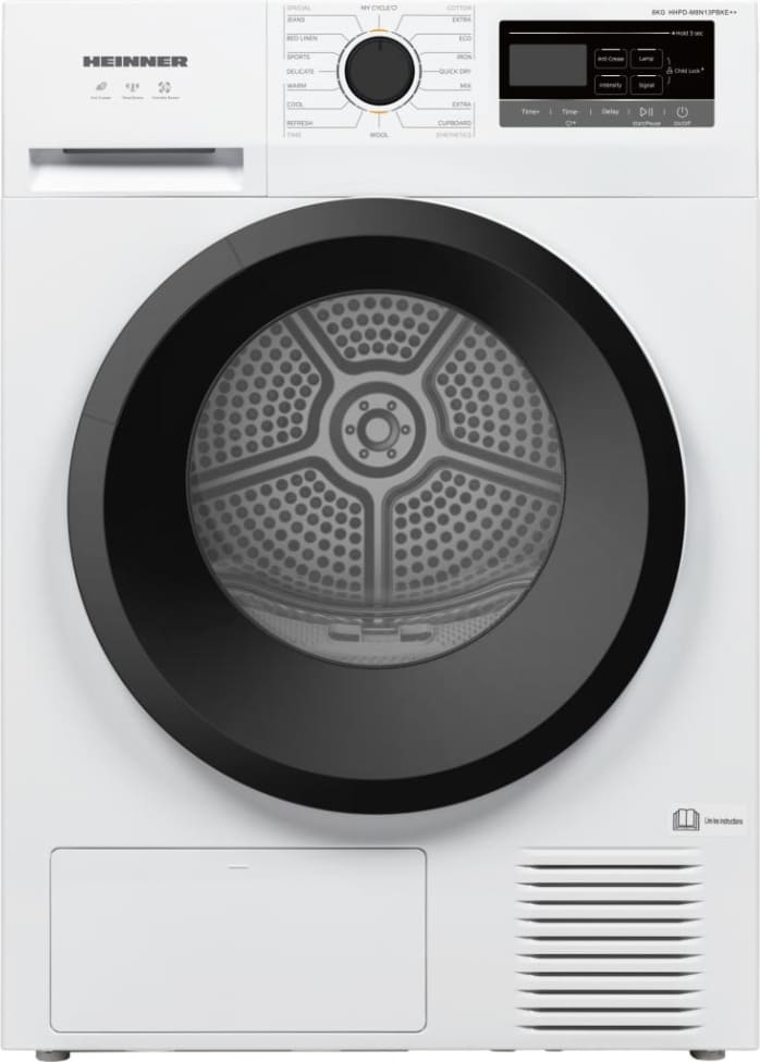 Džiovyklė su šilumos siurbliu HEINNER HHPD-M8N13PBKE++, Įkrovos talpa: 8 kg, Energijos vartojimo efektyvumo klasė: E, 16 džiovinimo programų, LED ekranas, Greita marškinių programa, Atidėto paleidimo funkcija, Apsauga nuo susiglamžymo, Būgno apšvietimas, Džiovinimo lygio parinkiklis, Pūkelio filtro valymo indikatorius, Pilno vandens rezervuaro indikatorius, Plastikinis durelių langelis, Vaikų apsauga, Matmenys (P × G × A): 59,5 × 60 × 85 cm, Spalva: Balta