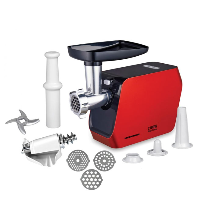 Mėsmalė Heinner Citrine 2100 MG-2100RD, 2100 W, pomidorų priedas, dešrų priedas, smulkinimo našumas: 1,8 kg/min, nerūdijančio plieno peiliai, 3 pjaustymo plokštelės, 2 greičiai, reverso funkcija, raudona..
