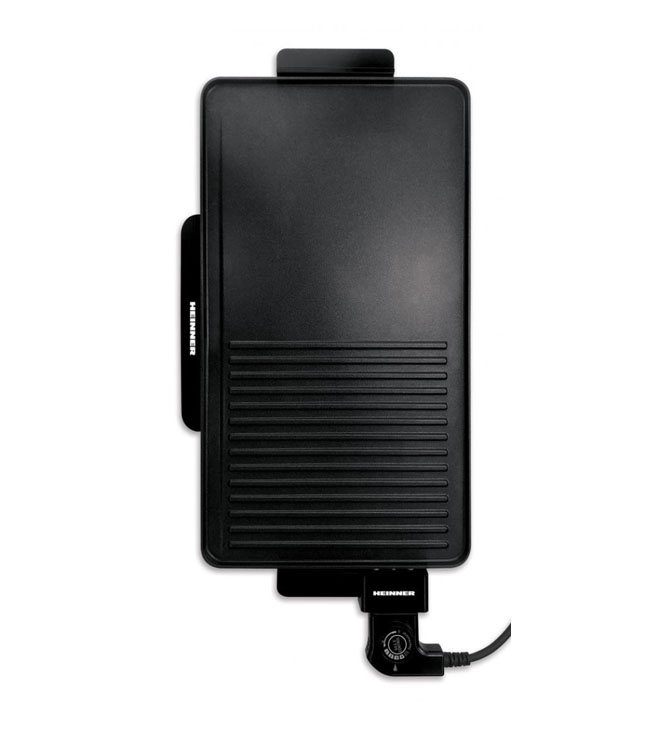Elektrinis grilis Heinner Grantgrill HEG-F2000GT, 2000 W, pusiau grilis, pusiau kepsninė, reguliuojama temperatūra, nelimpanti fiksuota plokštė, cool touch rankena, lašėjimo padėklas aliejui surinkti, plokštės matmenys: 49 x 27 cm, juodos spalvos