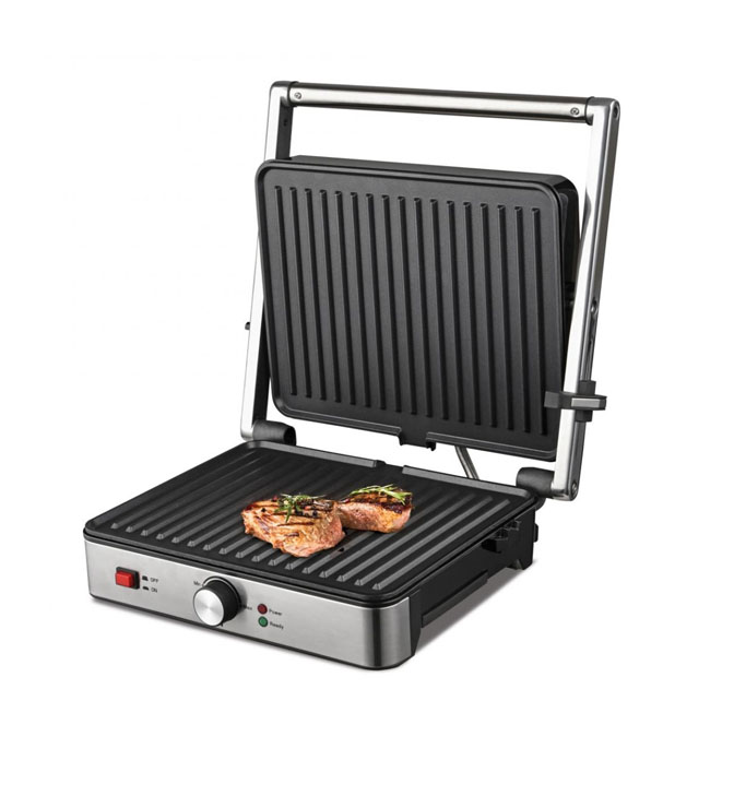 Elektrinis grilis „Heinner HEG-K2000SS“, 2000 W, fiksuotos plokštės su nelimpančia danga, reguliuojama temperatūra, 180 laipsnių atidarymas, „Cool Touch“ rankena, maitinimo ir parengties indikatorius, nuimamas lašėjimo padėklas, sidabrinės spalvos.