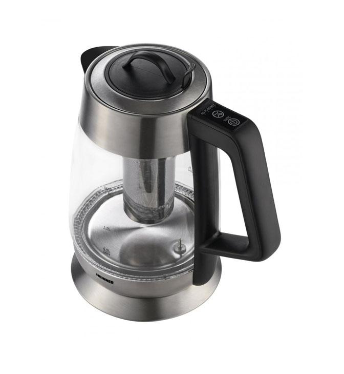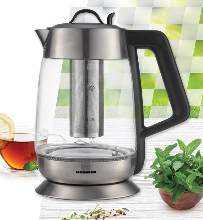 Elektrinis virdulys su arbatos filtru Heinner Cosmo 18 HEK-TF18GX, 1850-2200 W, su arbatos filtru, 1,8 l, LED apšvietimas, priklausomai nuo nustatytos temperatūros, nerūdijančio plieno kaitinimo elementas, apsauga nuo sauso užvirimo, automatinis išsijungimas, temperatūros nustatymai (60-100 °C), palaikymo funkcija, stiklinis korpusas.