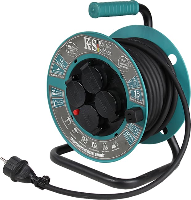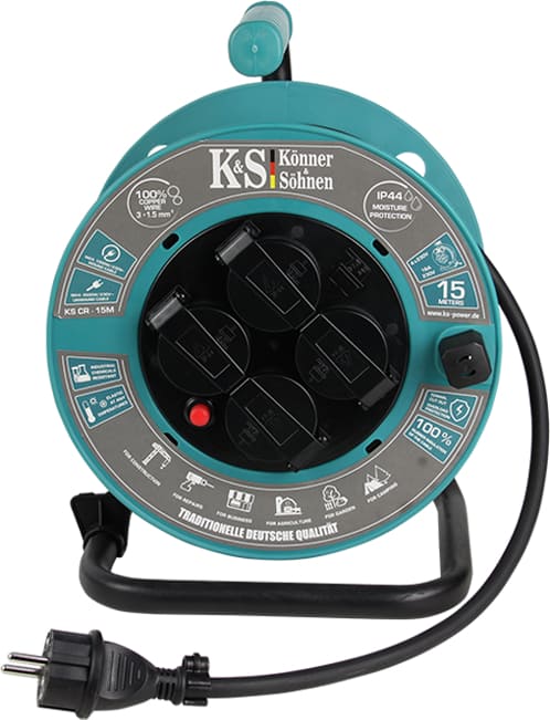 KS CR-15M kabelis ant ritės su 15 metrų ilgio kabeliu puikiai tinka prijungti iki 4 įrenginių prie 230V tinklo, ypač vietose, kur nėra fiksuotų lizdų. IP44 apsaugos klasė leidžia naudoti lauke ir drėgnose aplinkose, apsaugant nuo atsitiktinio vandens lašelių ir kietų dalelių patekimo.