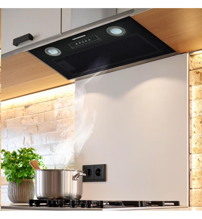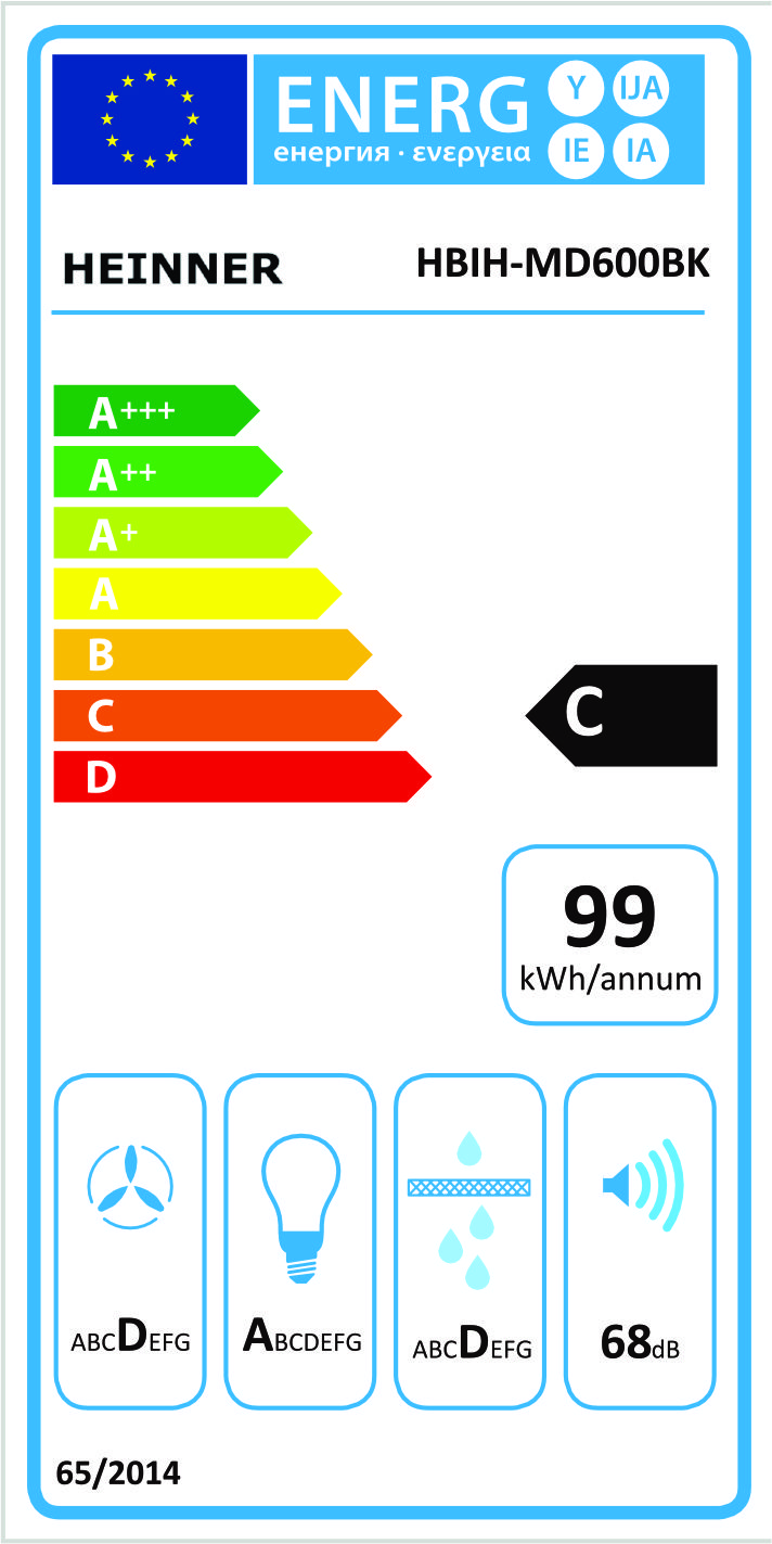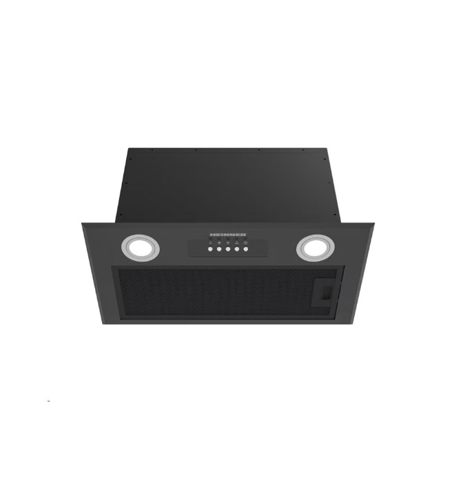 Įmontuojama gartraukio gaubtas Heinner HBIH-MD600BK, 60 cm, maksimali absorbcijos galia: 610 m³/h, 3 greičio nustatymai, variklis: 1 × 215 W, LED apšvietimas: 2 × 1,5 W, 1 aliuminis filtras, išmetimo vamzdžio skersmuo: 150 mm, matmenys (ilgis × plotis × aukštis): 52 × 28,4 × 29,9 cm, juodos spalvos.