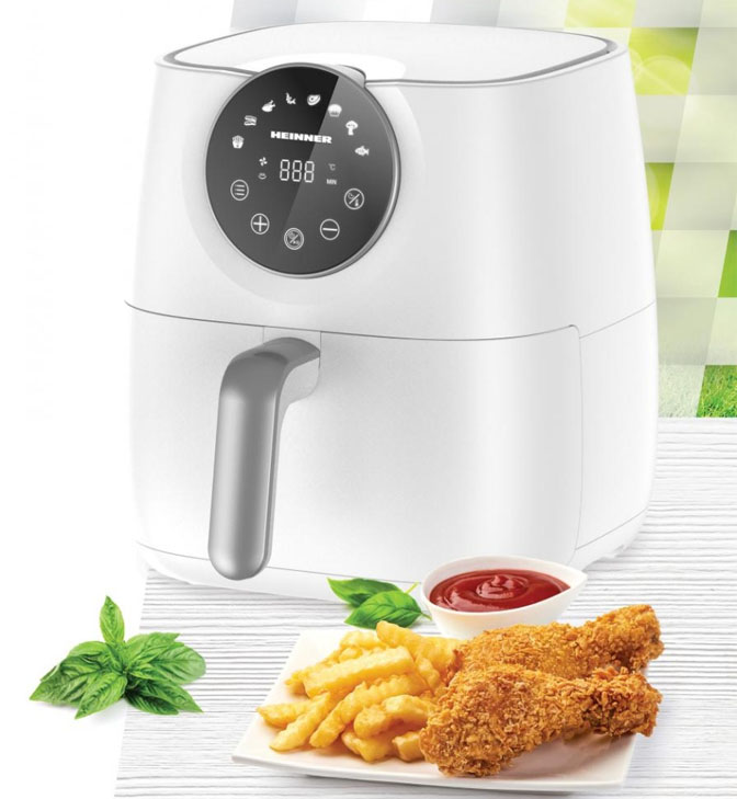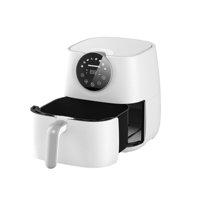 Karšto oro gruzdintuvė Heinner SmartFry HAF-B6WH1700, 1700W, talpa: 5.7L, skaitmeninis ekranas su lietimui jautriu valdymu, laikmatis: iki 60 min, temperatūros diapazonas: 80-200°C, 8 iš anksto nustatytos programos, nuimamas krepšelis, automatinis išjungimas, neslidžios kojelės, balta spalva