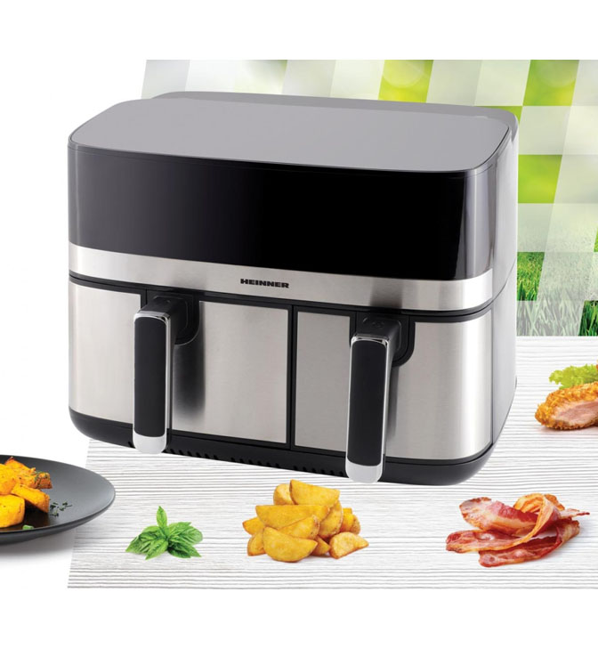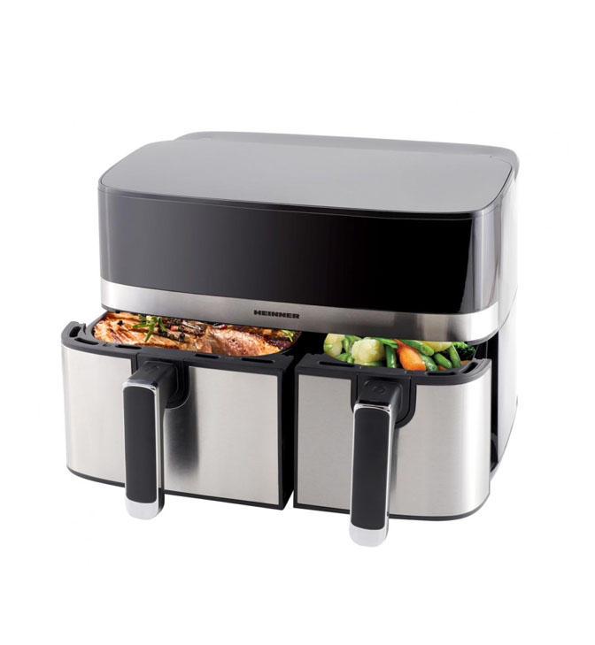 Dviguba oro keptuvė Heinner HAF-H9DB17BKS, 1700 W, bendra talpa 8,6 l, skaitmeninis ekranas ir jutiklinis valdymas, individualus valdymas, 8 iš anksto nustatyti programos, temperatūra 80–200 °C, sinchronizavimo ir suderinimo funkcija, automatinis išjungimas, nelipni danga, sidabrinė spalva.