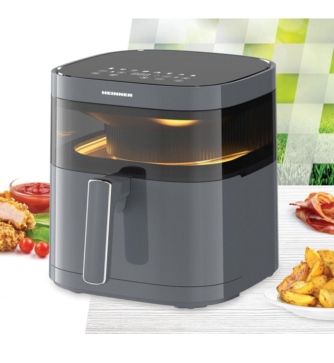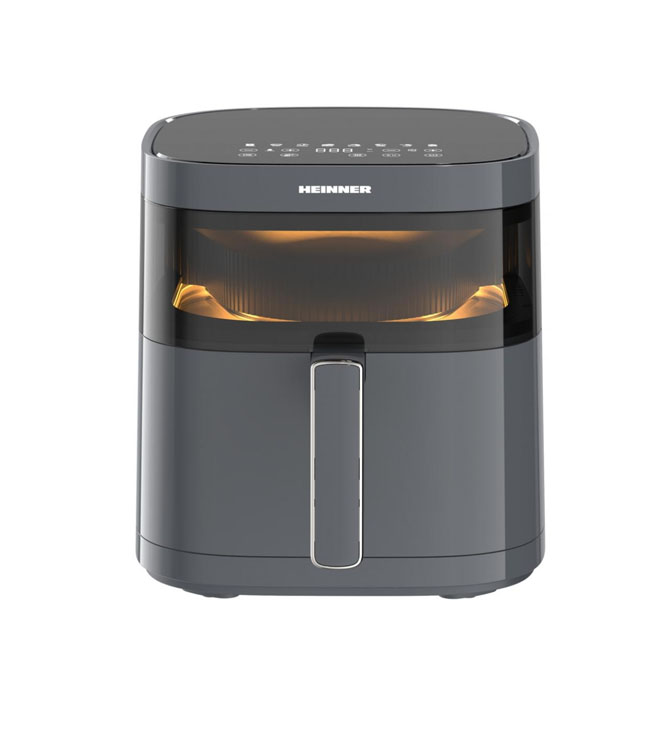 Karšto oro gruzdintuvė Heinner DualHeat HAF-B6GRY17LG, 1700W, krepšelio talpa: 5.7L, skaitmeninis ekranas, dvigubo kaitinimo technologija, metalinė vidinė kamera, temperatūros diapazonas: 80-200°C, laikmatis: iki 60 min, 8 iš anksto nustatytos programos, nuimamas krepšelis, stebėjimo langas, vidinis apšvietimas, automatinis išsijungimas, spalva: antracitas
