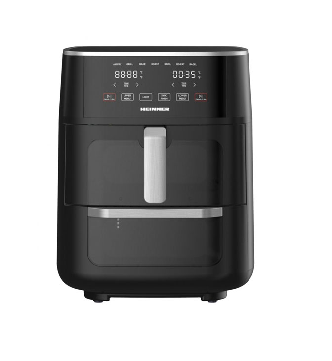 Dvigubos zonos, karšto oro gruzdintuvė Heinner OvenFry Cook HAFO-M11BK1700, 1500-1850W, du skyreliai (karšto oro gruzdintuvė ir orkaitė), bendra talpa: 11L (6 + 5L), skaitmeninis ekranas su lietimui jautriu valdymu, laikmatis: iki 90 min, temperatūros diapazonas: 40-230°C, 10 iš anksto nustatytų programų, funkcijos: Sync Finish, Sync Cook, permatomas langas, vidinis apšvietimas, automatinis išjungimas, spalva: juoda