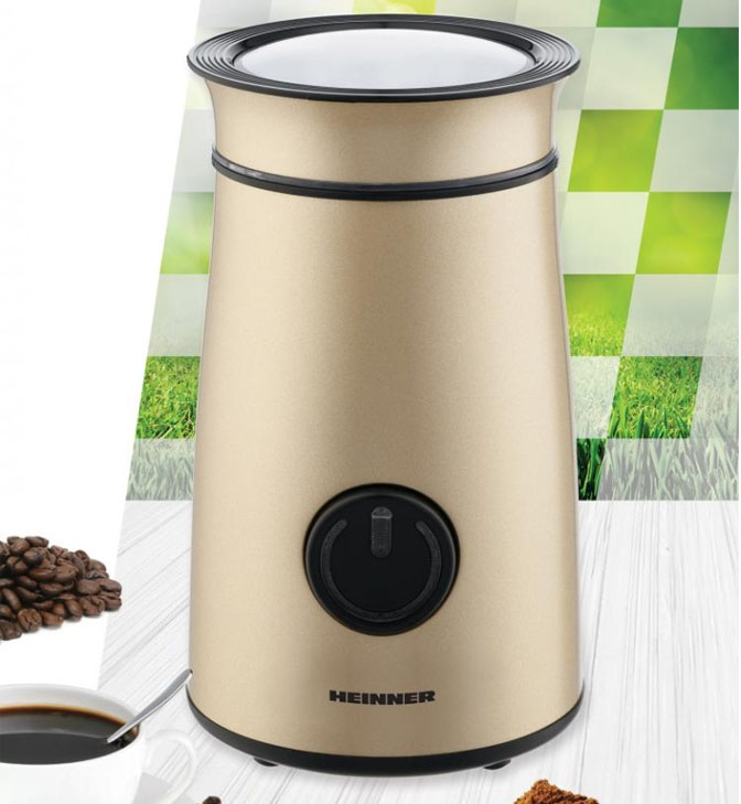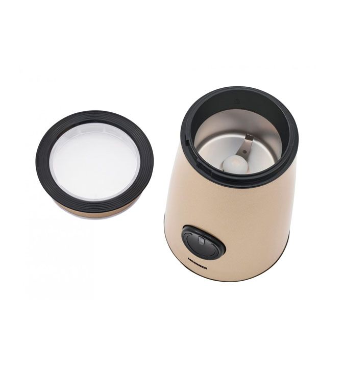 Elektrinis kavos malūnėlis „Heinner Longold 150 HCG-150IXGD“, 150 W, talpa: 50 g, nerūdijančio plieno malimo peiliukai, apsauginio užrakto sistema, mygtukas, aukso spalvos.