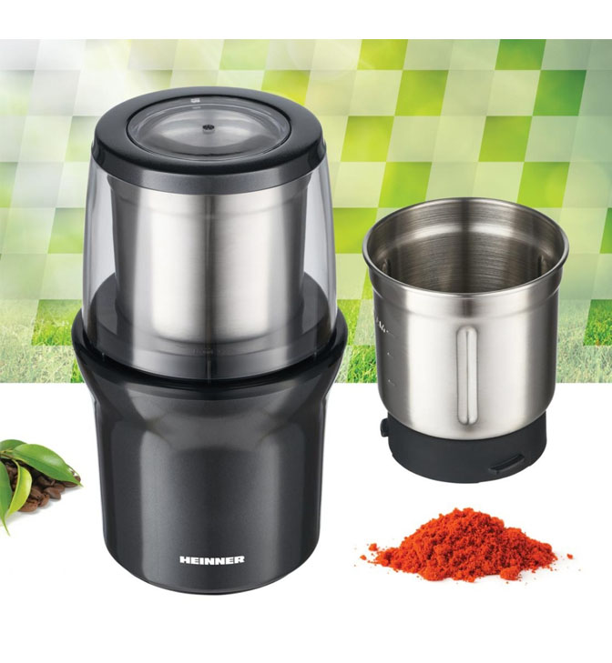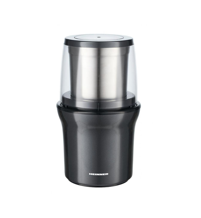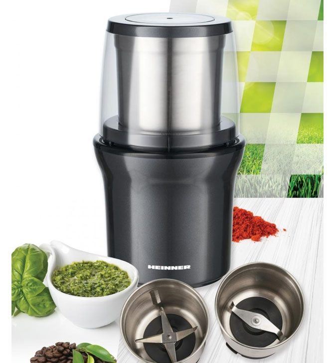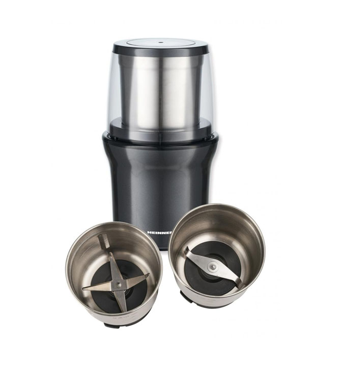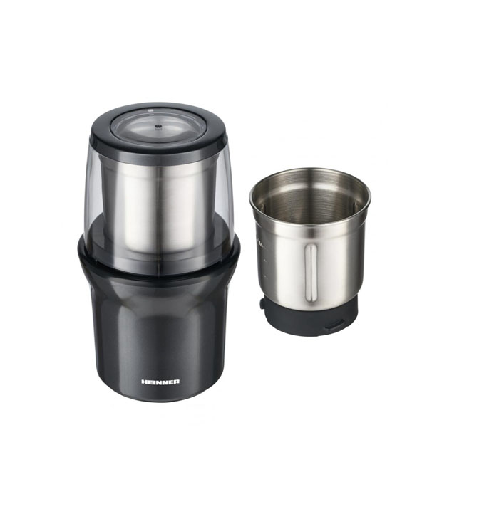 Elektrinis kavos malūnėlis „Heinner Gemmini HCG-200DGIX2“, 200 W, talpa: 70 g, 2 nuimami nerūdijančio plieno puodeliai, šlapias ir sausas malimas, nerūdijančio plieno malimo peiliukai, stumdomas dangtelis, kad būtų lengva valdyti, nerūdijančio plieno korpusas.