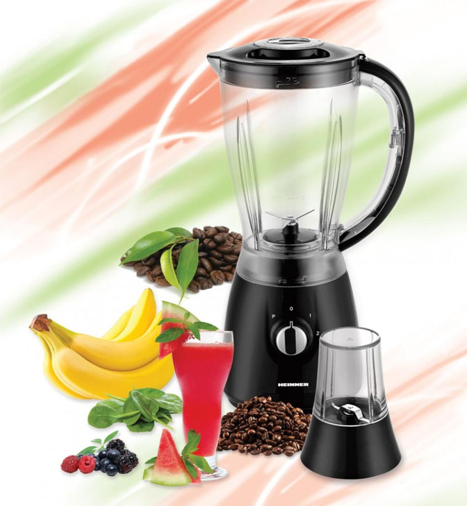 Stacionarus blenderis HEINNER HBL-500R, 500W, Komplekte yra malūnėlis, Talpa 1.5L, Nerūdijančio plieno peilis, 2 greičiai + Impulsas, Saugos sistema, Neslystančios kojelės, Matmenys (I x P x A) 21x17x39 cm, Svoris 1.9 kg, Spalva: Juoda
