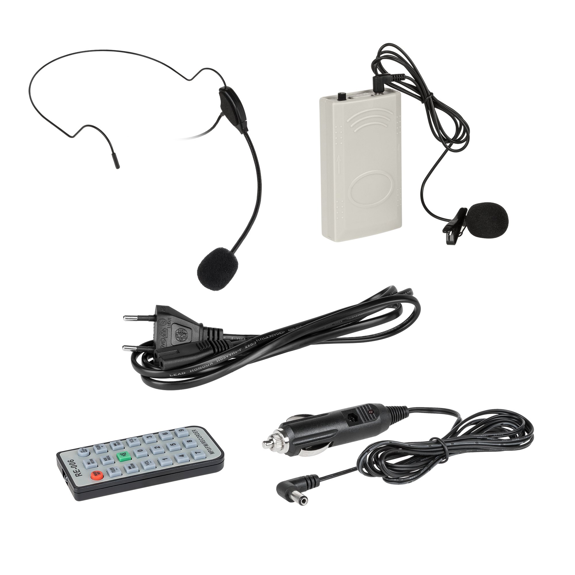 W zestawie: Jednostka główna, mikrofon ręczny, mikrofon na klips, mikrofon nagłowny, torba, zasilacz samochodowy, instrukcja obsługi