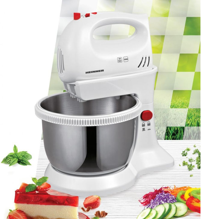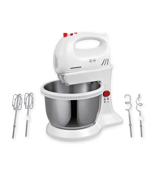 Standusis maišytuvas su dubeniu Heinner HMBR-300W, 300 W, nerūdijančio plieno, besisukančio dubens talpa: 3,4 l, 5 greičiai + Turbo, užrakto mygtukas, nerūdijančio plieno tešlos kabliukai ir plaktuvai, baltos spalvos.