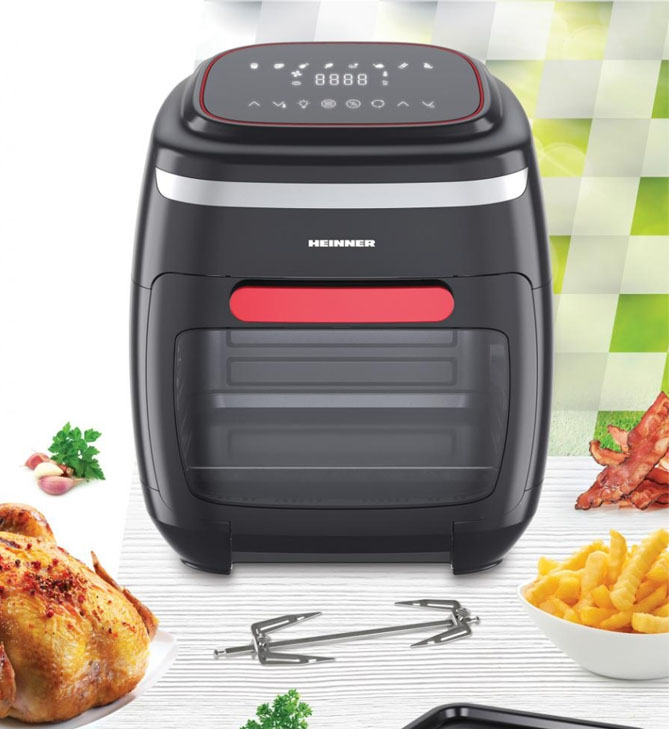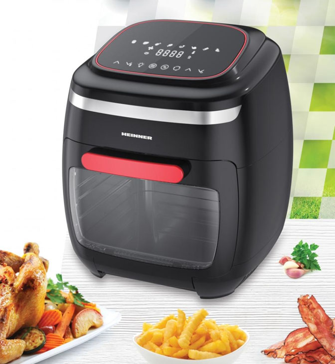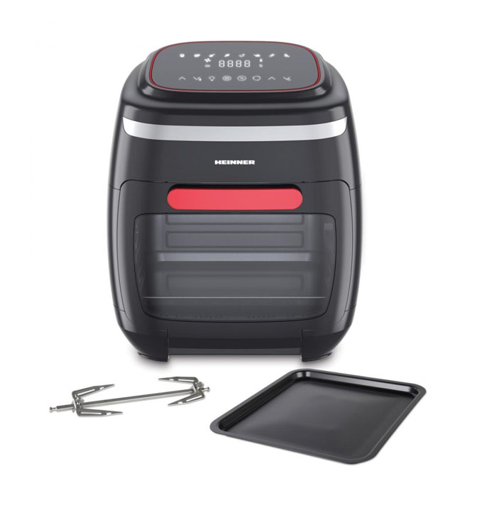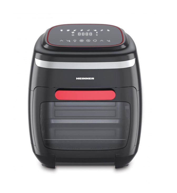Karšto oro gruzdintuvė Heinner Crystal Clear HAF-B2000FB, 2000W, orkaitės talpa: 11L, krepšelio talpa: 4.5L, lietimui jautrus valdymo skydelis, 8 kepimo programos, riebalų surinkimo padėklas, 3 oro srauto grotelės, besisukantis iešmas, rotisserie rankena, reguliuojama temperatūra: 30-200°C, laikmatis: iki 4 valandų, automatinis išjungimas, neslidžios kojelės, juoda ir raudona