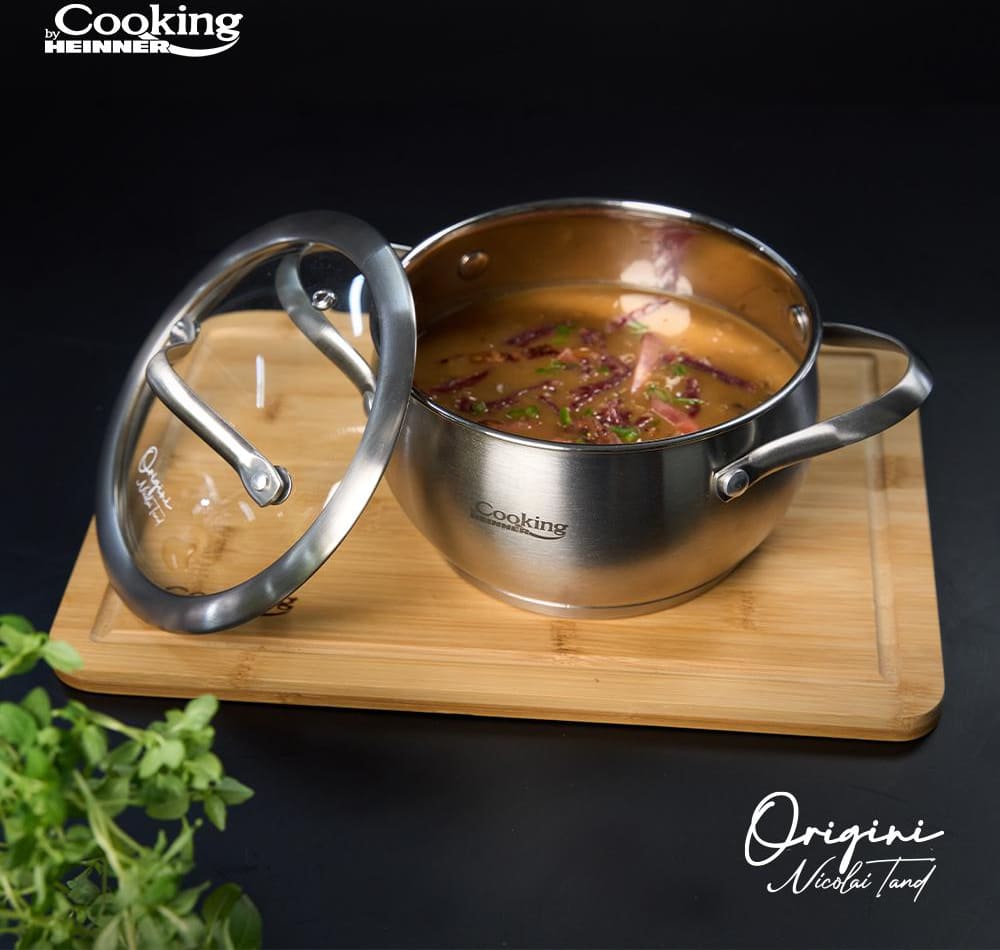 Nicolai Tand nerūdijančio plieno puodų linija sukurta tam, kad virtuvėje turėtumėte patikimą pagalbininką, nepriklausomai nuo to, ką planuojate gaminti. 5 sluoksnių kapsuliuotas dugnas tinka visų tipų viryklėms, įskaitant indukcines. Vidinė matavimo skalė leidžia patogiai nustatyti tūrį, o veidrodinio blizgesio vidus ir matinė išorė sukuria idealų produktą Jūsų virtuvei. Karščiui atsparaus stiklo dangčiai užtikrina optimalų slėgio kontrolę ir išsaugo aromatus indo viduje. Be to, bet kuris šios linijos gaminys arba visa linija yra puiki dovana bet kokiai progai, ypač įkurtuvių proga.