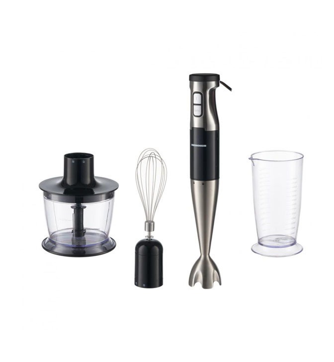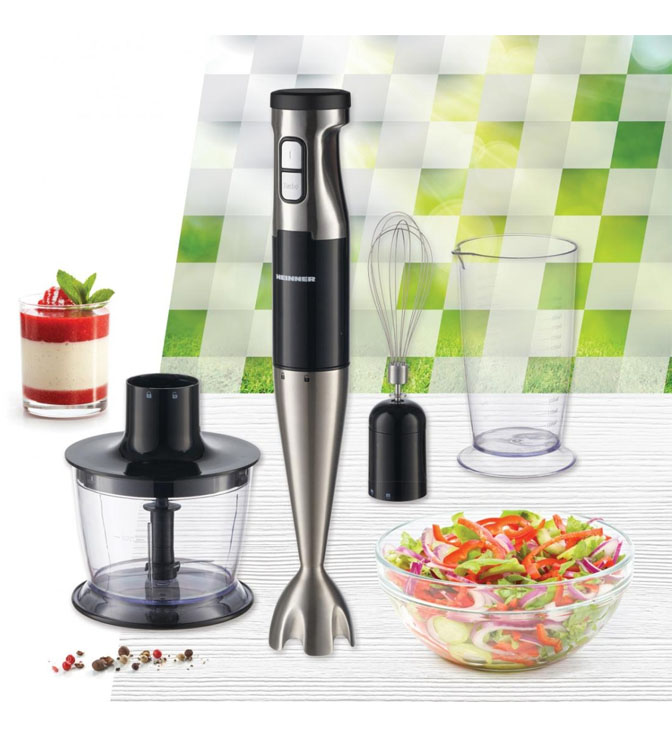 Rankinis trintuvas HEINNER INFINITEMIX HB-1000XBK, 1000W, Priedai: smulkintuvas, plaktuvas ir maišymo indas, Reguliuojamas greitis + Turbo, Nerūdijančio plieno peiliai, Nerūdijančio plieno trintuvo kotas, Matmenys (I x P x A) 6.4x6.4x39.4 cm, Svoris 1.44 kg, Spalva: Nerūdijantis plienas / juoda
