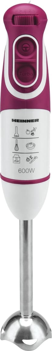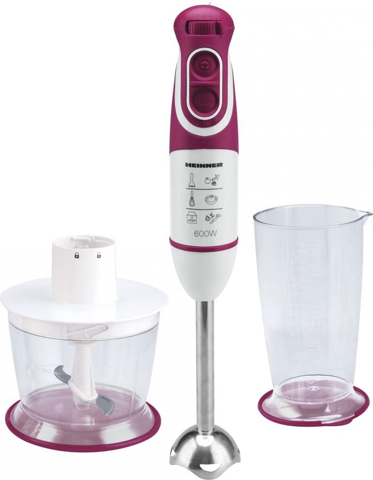 Rankinis trintuvas HEINNER CHARM HB-600BG, 600W, Daugiafunkcinis: su smulkintuvu, plaktuvu ir maišymo indu, 5 greičiai + Turbo, Nuimamas nerūdijančio plieno trintuvo kotas, Nerūdijančio plieno peiliai, Matmenys (I x P x A) 6.3x6.3x40 cm, Svoris 1.44 kg, Spalva: Balta su bordo