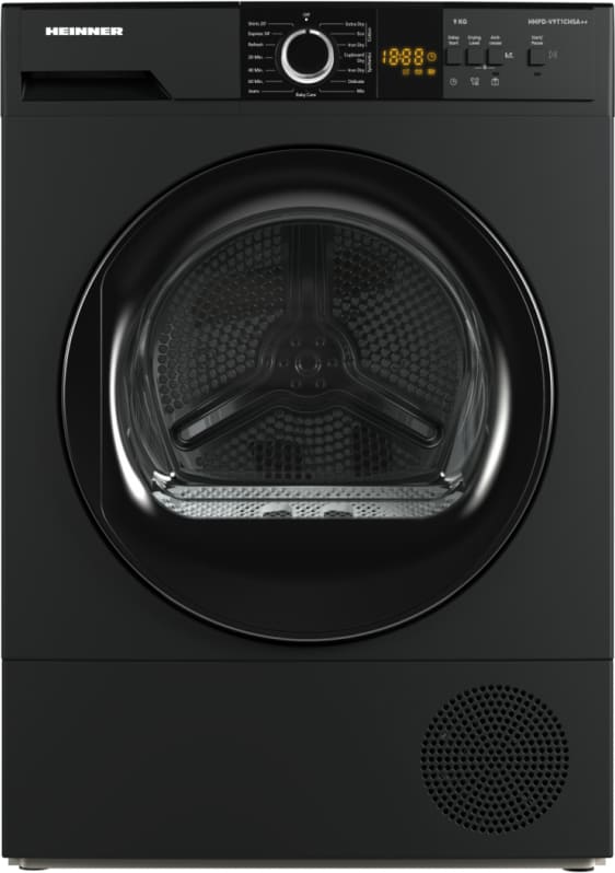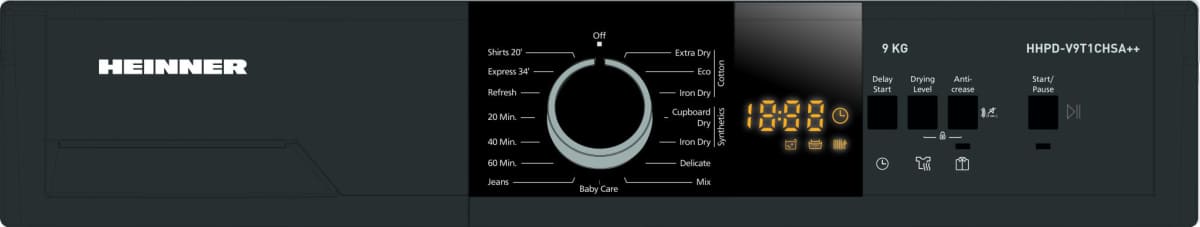 Džiovyklė su šilumos siurbliu Heinner HHPD-V9T1CHSA++, Krovimo talpa: 9 kg, Energijos klasė: E, 15 džiovinimo programų, LED ekranas, Greito marškinių džiovinimo programa – 20 min, Greito džiovinimo programa – 34 min, Programa kūdikių rūbams, Atidėto paleidimo funkcija, Apsauga nuo susiglamžymo, Būgno apšvietimas, Džiovinimo lygio pasirinkimas,