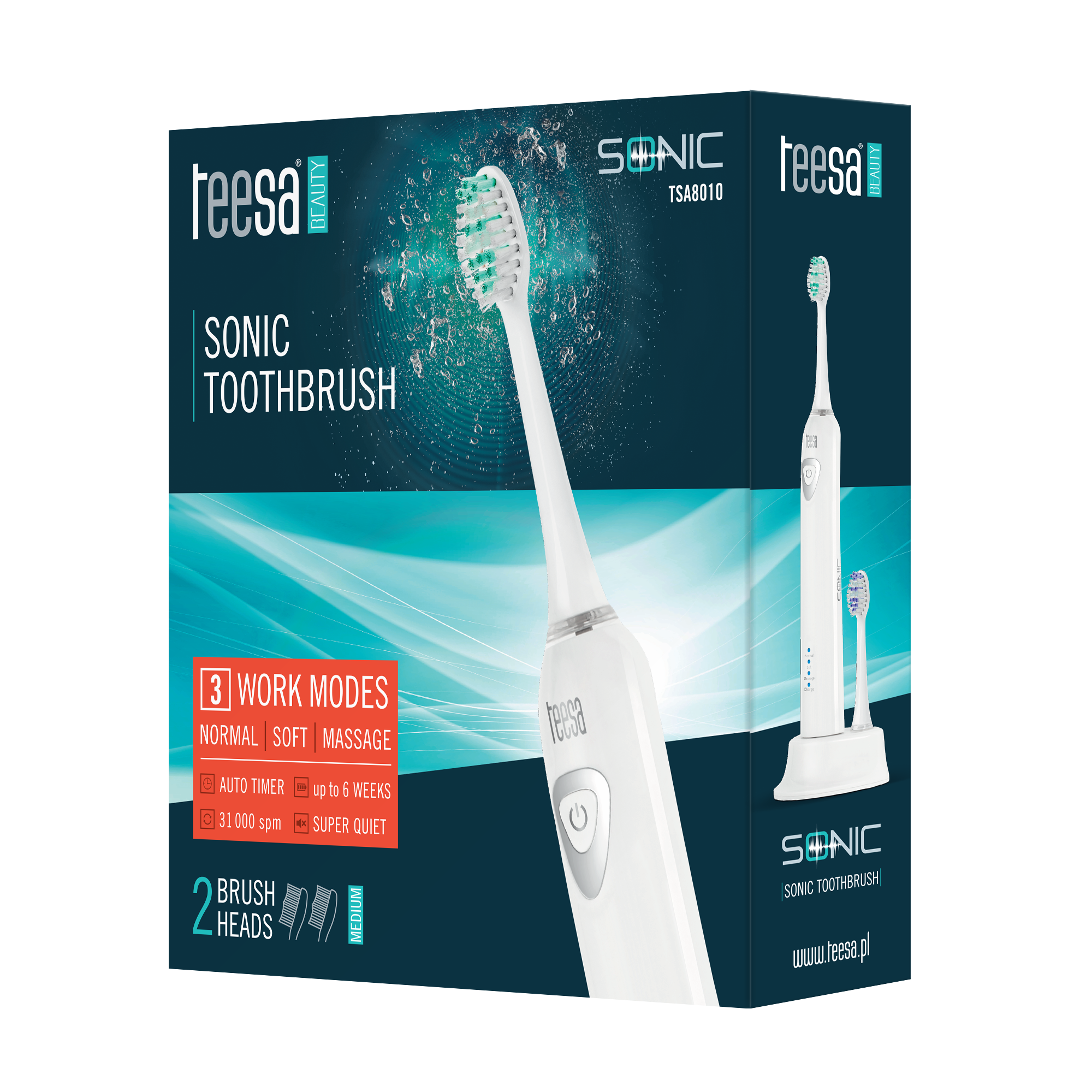 3 veikimo režimai: - Normalus (standartinis) - Minkštas (Minkštas) - Masažas (Masažas) 31.000 pulso judesiai / min. (kiekvienu režimu) Apsauginis laipsnis: IPX7 Automatinis išjungimas po 2 minučių; priminimas kas 30 sekundžių Vidutiniai plaukai apima 2 galvutes Garso lygis: indukcinis įkroviklis Naudokite laiką po vieno krūvio: iki 6 savaičių arba iki 180 minučių nepertraukiamo veikimo Baterija: 700 mAh maitinimo: 100-240 V; 50 / 60 Hz