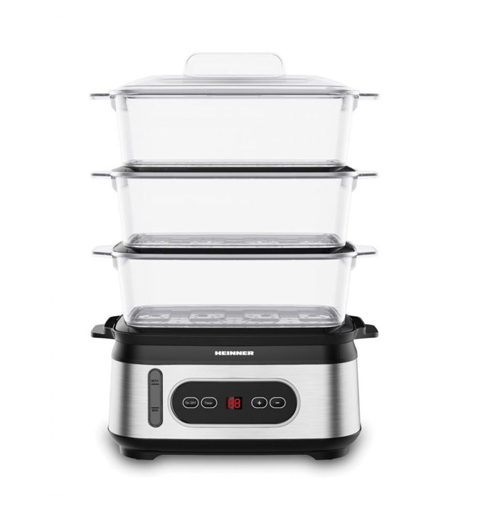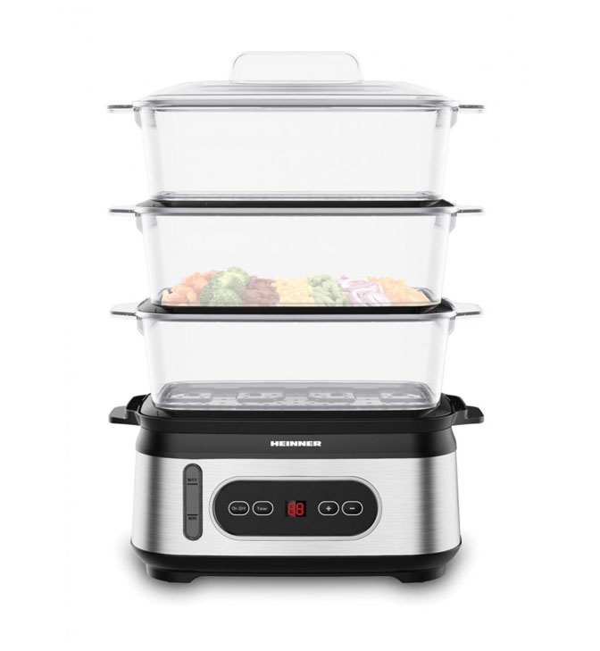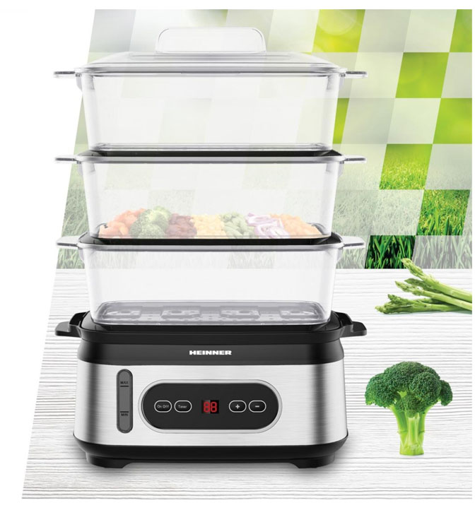 Steamer „Heinner OneSteam HSA-D950SS“, LED ekranas, 3 sluoksnių garų talpyklos be BPA, bendra virimo talpa: 9 l, vandens talpyklos talpa: 1,5 l, laikmatis 60 min, šviesos indikatorius, apsauga nuo užvirimo ir išdžiūvimo, maitinimo laido laikymo vieta, galia: 800-950 W.