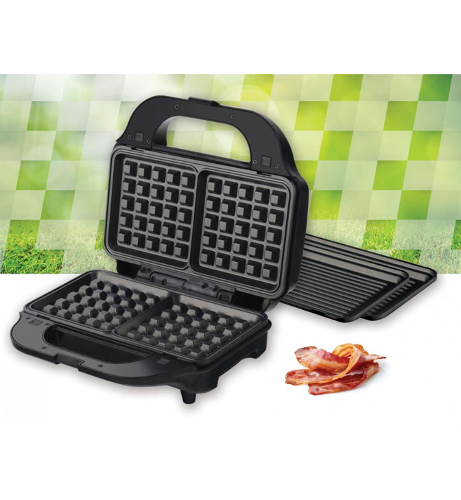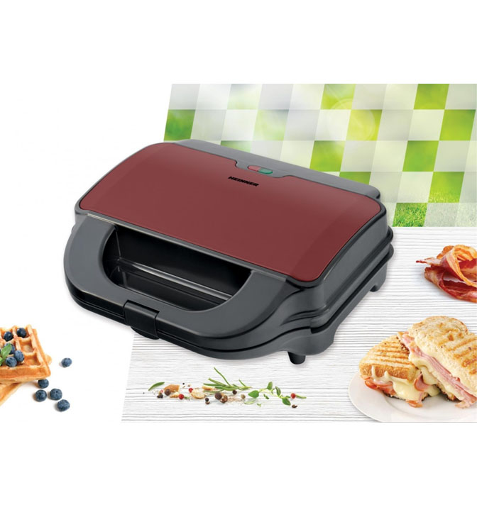 Sumuštinių keptuvė HEINNER Crispy Morning SM-2H900BKS, 900 W, 2 sumuštinių talpa, 2 didelės plokštės: grilis ir vafliai, Nelimpančios plokštės, Vėsi rankena, Įjungimo / išjungimo lemputė, Parengties indikatorius, Plokščių matmenys: 28 x 15 cm, Spalva: juoda / bordinė.