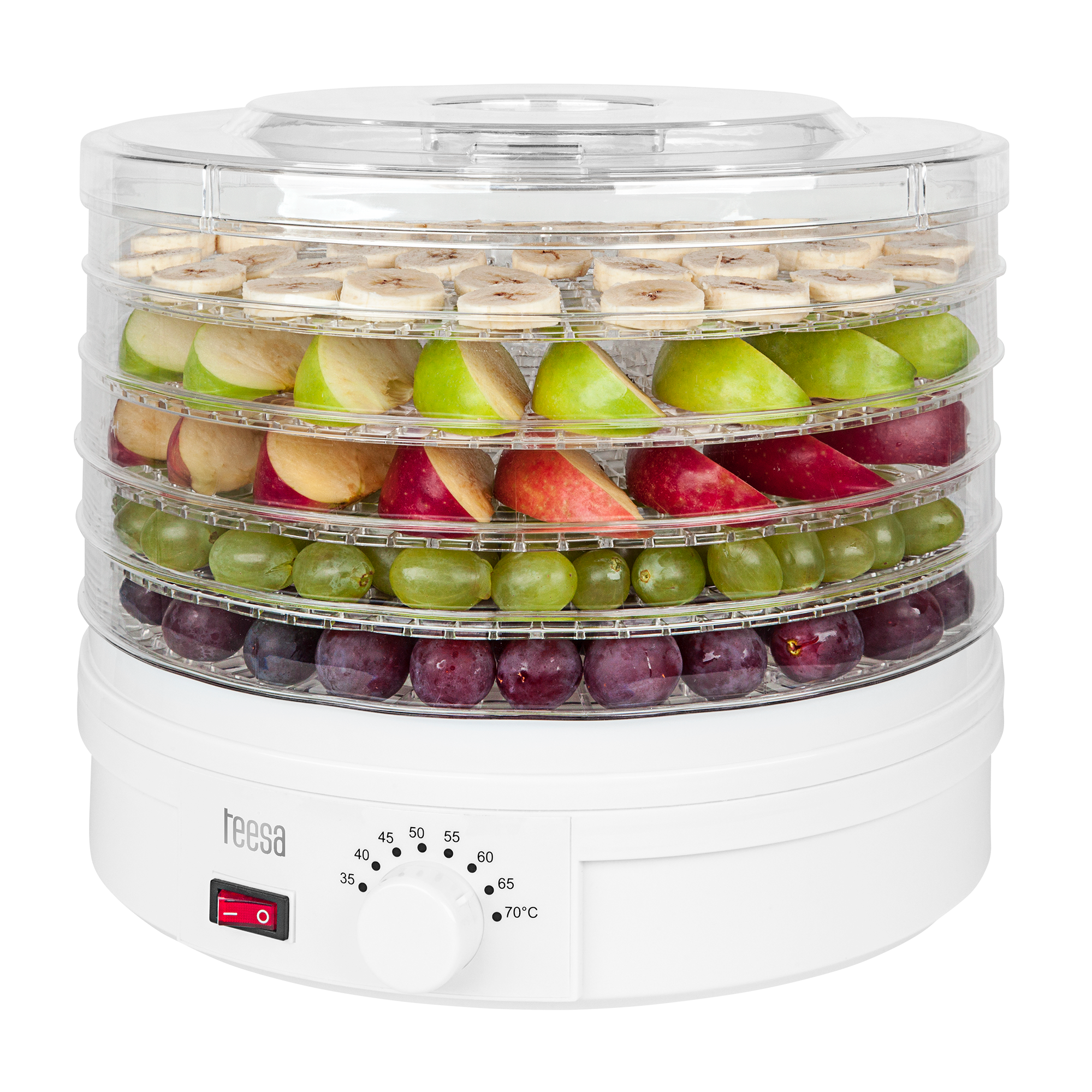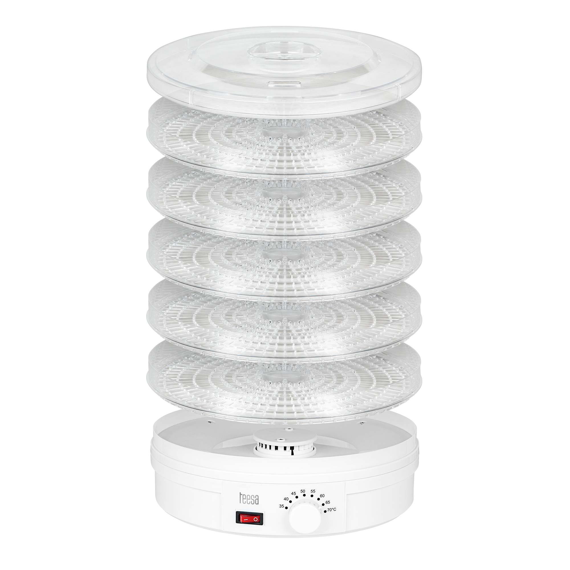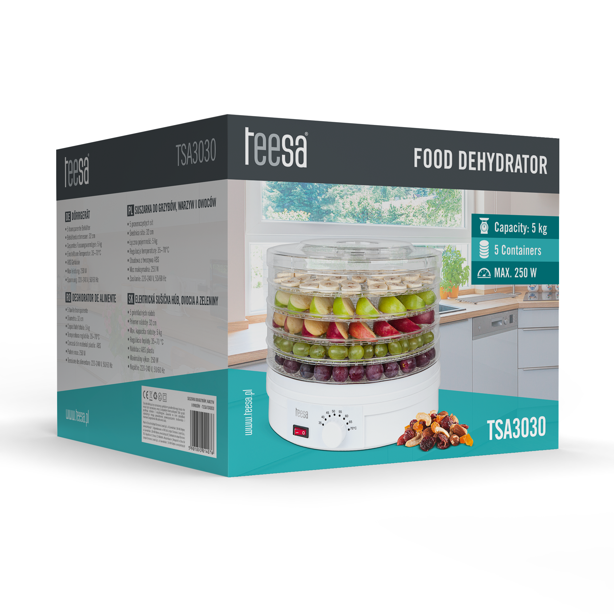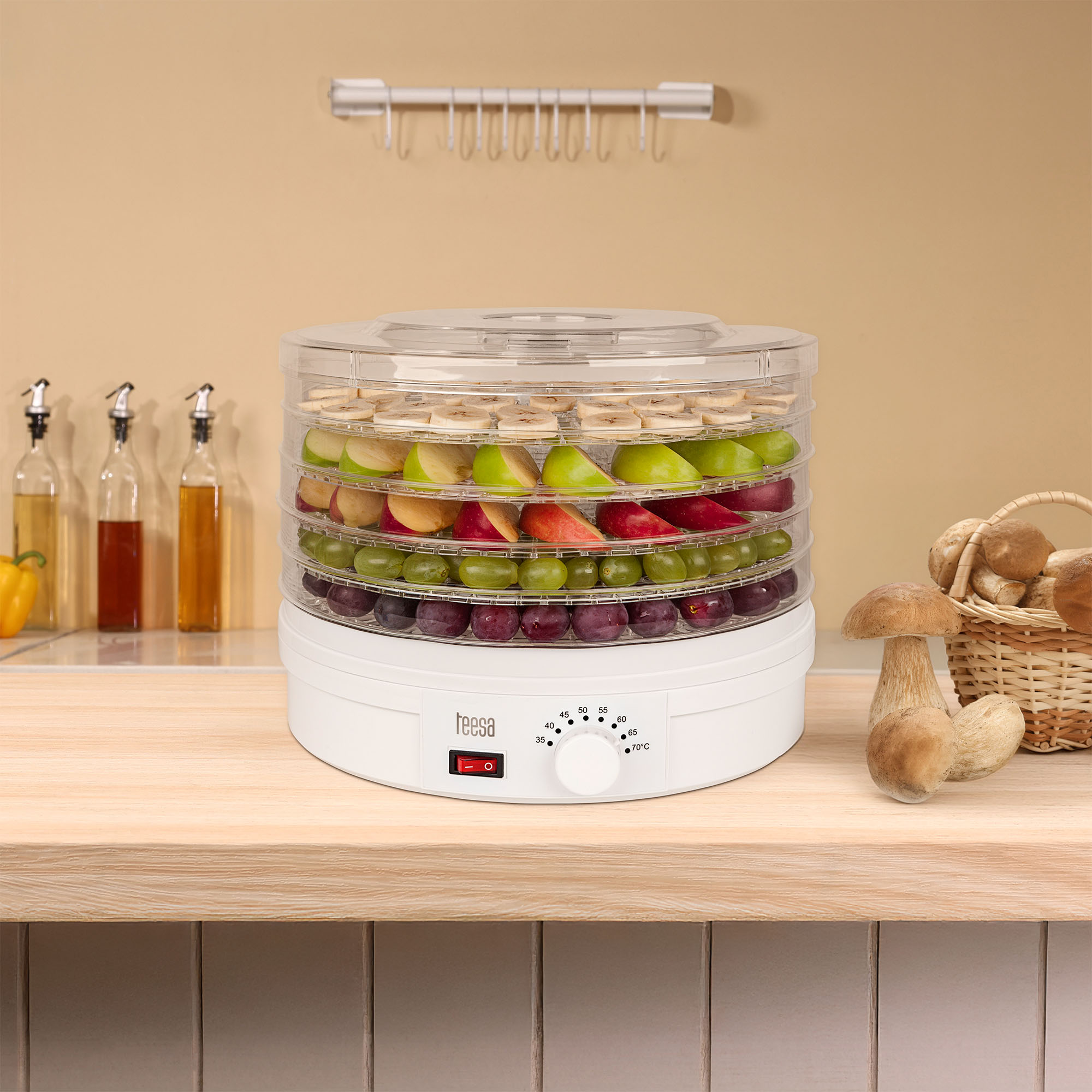 Sienų skaičius: 5 Plokštelių skersmuo: 32 cm Plokštelės aukštis: 3 cm Džiovinimo talpa: 5 kg Temperatūros kontrolė: 35 -70 ° Maksimali galia: 250 W Maitinimas: 220-240 V 50 / 60 Hz Apsauginis nuo perkaitimo Pakuotės matmenys (DxSxW): 33 x 33 x 27 cm Svoris: 2.92 kg (bendrasis), 2.4 kg (grynasis)
