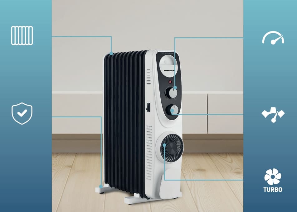 Alyvuotas radiatorius Heinner HOH-MVT11WH-BK, 2300 W, 11 elementų, turboventiliatorius, 3 šilumos nustatymai, reguliuojamas termostatas, apsauga nuo perkaitimo, baltas/juodas