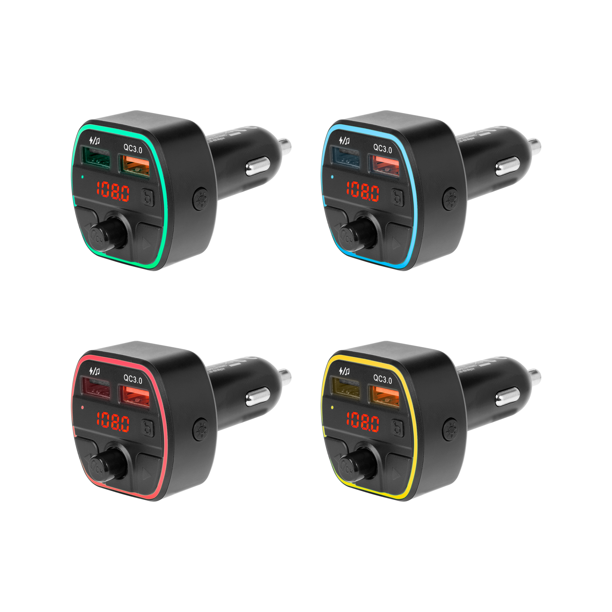 Bluetooth 5.0 BluetoOth nuotolis: iki 10 m BluetoOth profiliai: EDR, HSP, HFP, A2DP, AVRCP, AVCTP, AVDTP, SPP, DĮR, SPT, GAP, GATT, RFCOMM, SDP, 12CAP 2x USB prievadas: USB 1 - įkrovimas ir žaismas USB 2 - įkrovimas lizdas ant mikroSD kortelės (maks. 64 GB) Garso formatas: MP3, WMA, WAC, FLAC LED ekranas: 0,75 "BASS funkcija Built- mikrofonas Balso skambučio palaikymas Išėjimo įtampa: USB 1 - 5 V / 3 A, 9 / 2 A, 12 V / 1 A, 12 V / 1.5 A Dažnių diapazonas: 87,5 - 108 MHz Maitinimas: 24 MHz