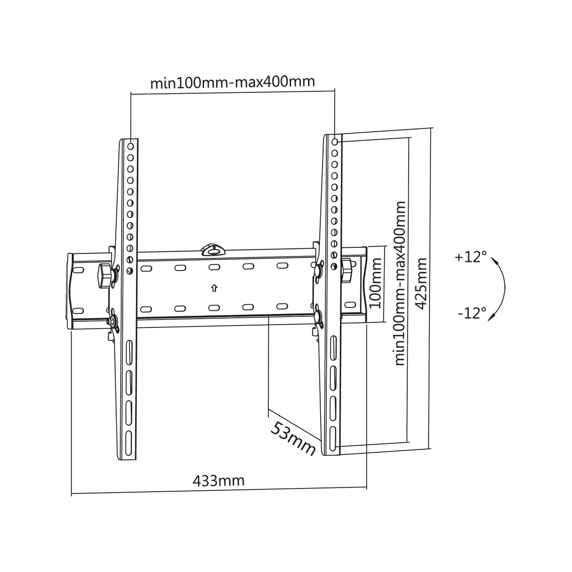 Naudojimas: LCD televizoriai Montavimas: Sienos tipas: Grįžtamas Ekrano dydis: 32 "- 55" Maks. apkrova: 40 kg VESA Standartas: 200x200, 400x200, 300x300, 400x400 Vertikalus reguliavimas: + 12 ° ~ -12 ° atstumas nuo sienos: 53 mm Horizontalus: Stacionarus kabelis Valdymas: Netaikoma išlenktiems skydams: Priešvagių spynA: Nr Medžiaga: Plienas Paviršiaus apdaila: Miltelių spalvos: Juoda Įtraukti į rinkinį: tvirtinimo varžtai Matmenys: 433 x 425 x 53 mm