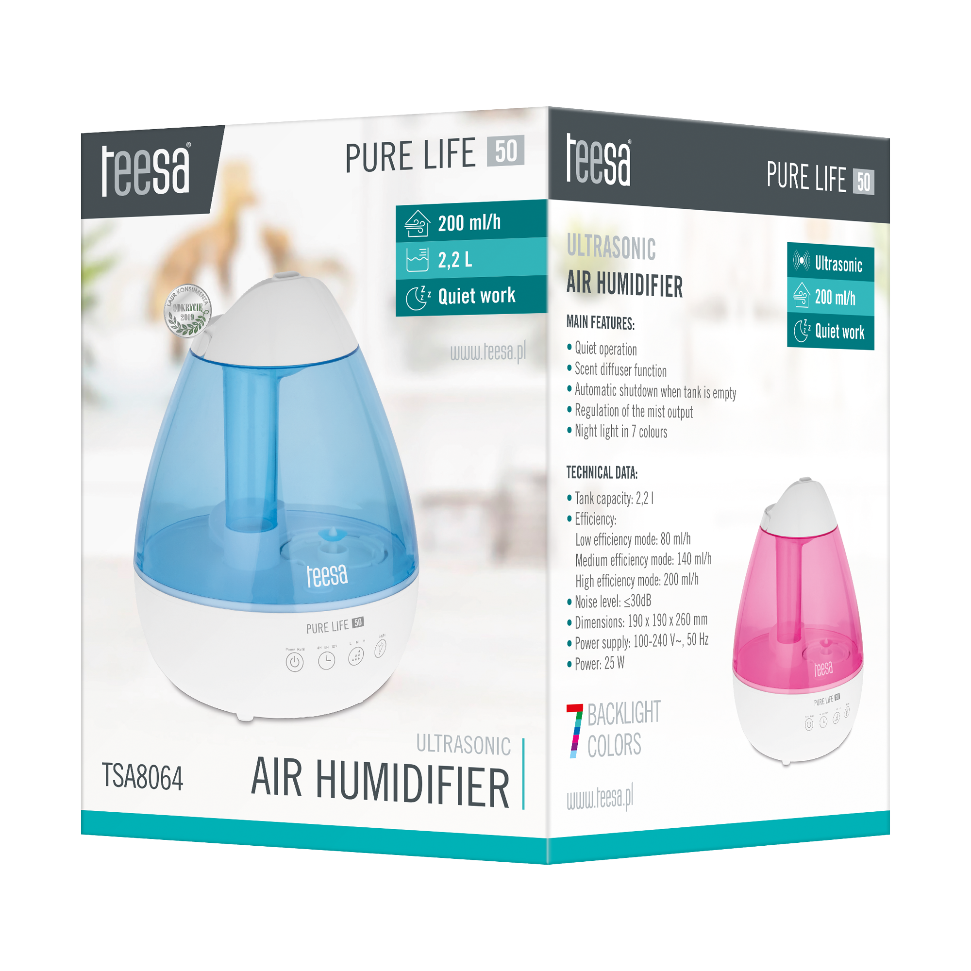 Silent operation Smell diffuser function Automatinis išsijungimas ištuštinus baką Valdykite pagamintų garų našumą 7 naktinio apšvietimo spalvų bakas: 2,2 l Talpa: • Žemo našumo režimas: 80 ml / h • Vidutinio našumo režimas: 140 ml / h • Aukšto našumo režimas: 200 ml / h Power: 25 W Triukšmo lygis: = Kabelio ilgis: 150 cm Matmenys: 190 x 190 x 254 mm Maitinimo šaltinis: 100- 240 V ~, 50 Hz apima: valymo šepetėlis
