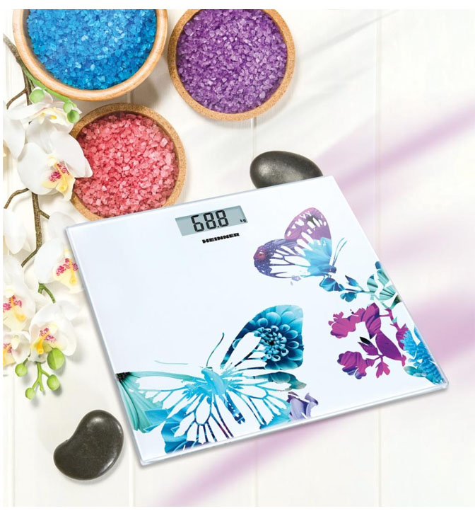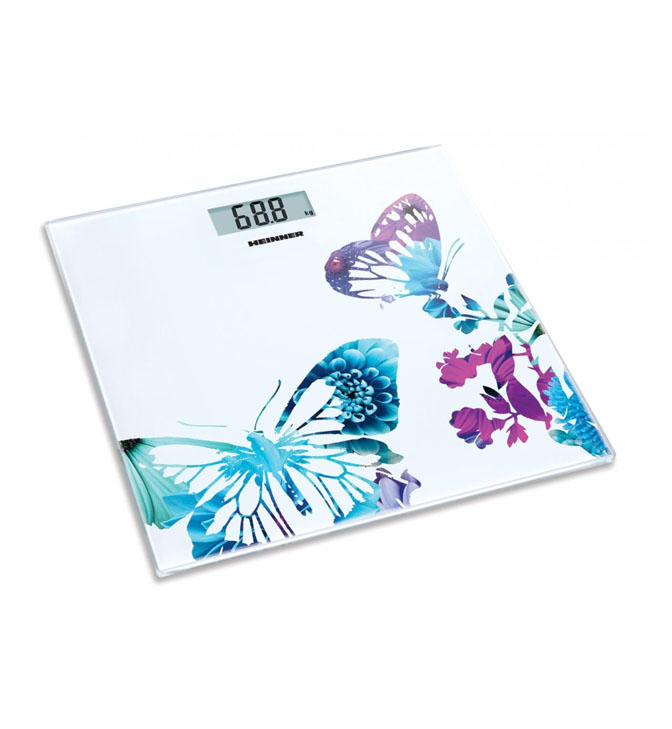 Vonios svarstyklės Heinner Butterfly 150 HBS-150BTF, 150 kg, 6 mm grūdinto stiklo platforma, LCD ekranas, padalijimas: 100 g, automatinis įjungimas / išjungimas, išsikrovusio akumuliatoriaus indikatorius, perkrovos indikatorius, pridedama baterija: 1 x CR2032 Li.