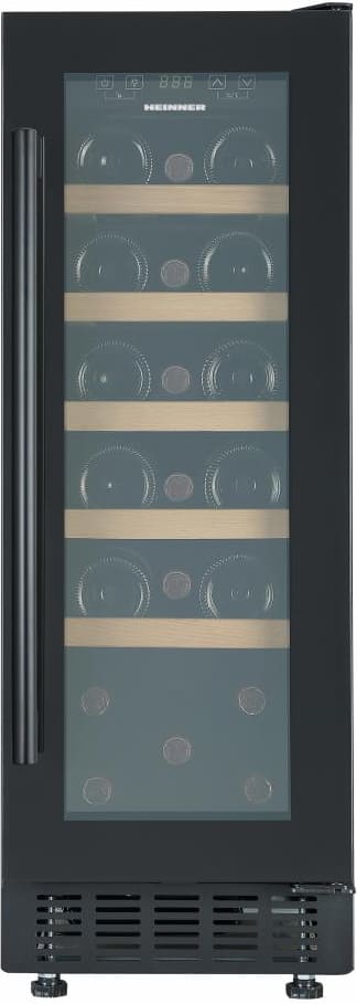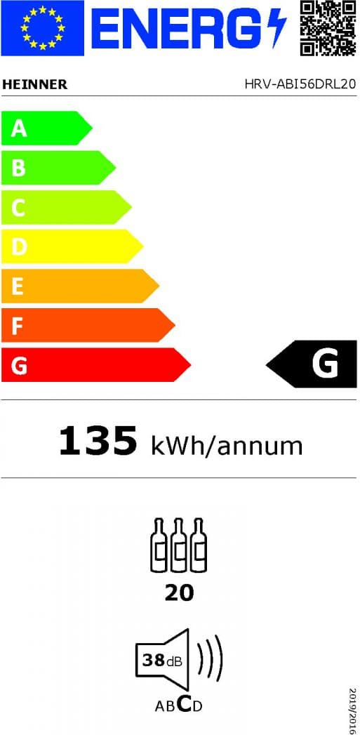 Heinner HRV-ABI56DRL20 – įmontuojama vienos zonos vyno šaldyklė, skirta iki 20 butelių laikymui. Ji turi elektroninį valdymą su LED ekranu, medines lentynas ir apverčiamas duris moderniame juodame dizaine.