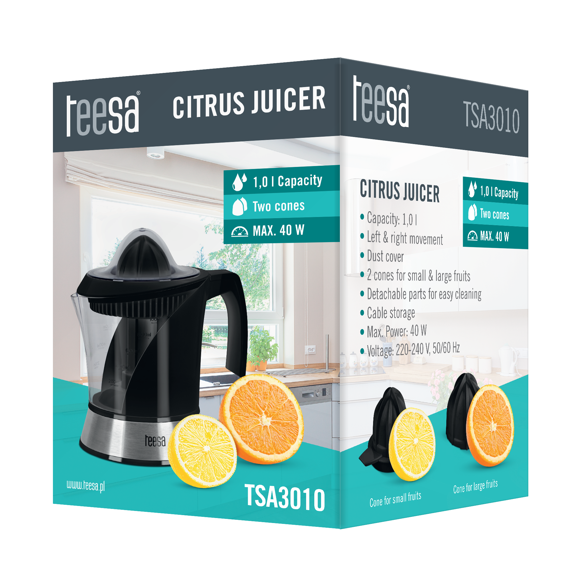 Maksimali galia: 40 W Talpa: 1,0 l Dvi sukimosi kryptys: taip Kištukinių lizdų skaičius: 2 Korpuso spalva: juoda su elementais, pagamintais iš šepečio nerūdijančio plieno dulkių saugiklio: taip Kabelio skyrius: Maitinimo šaltinis: 220-240 V, 50 / 60 Hz Pakuotės matmenys (DxSxW): 17 x 17 x 24 cm Svoris: 1 kg (bendrasis), 0,81 kg (grynasis)
