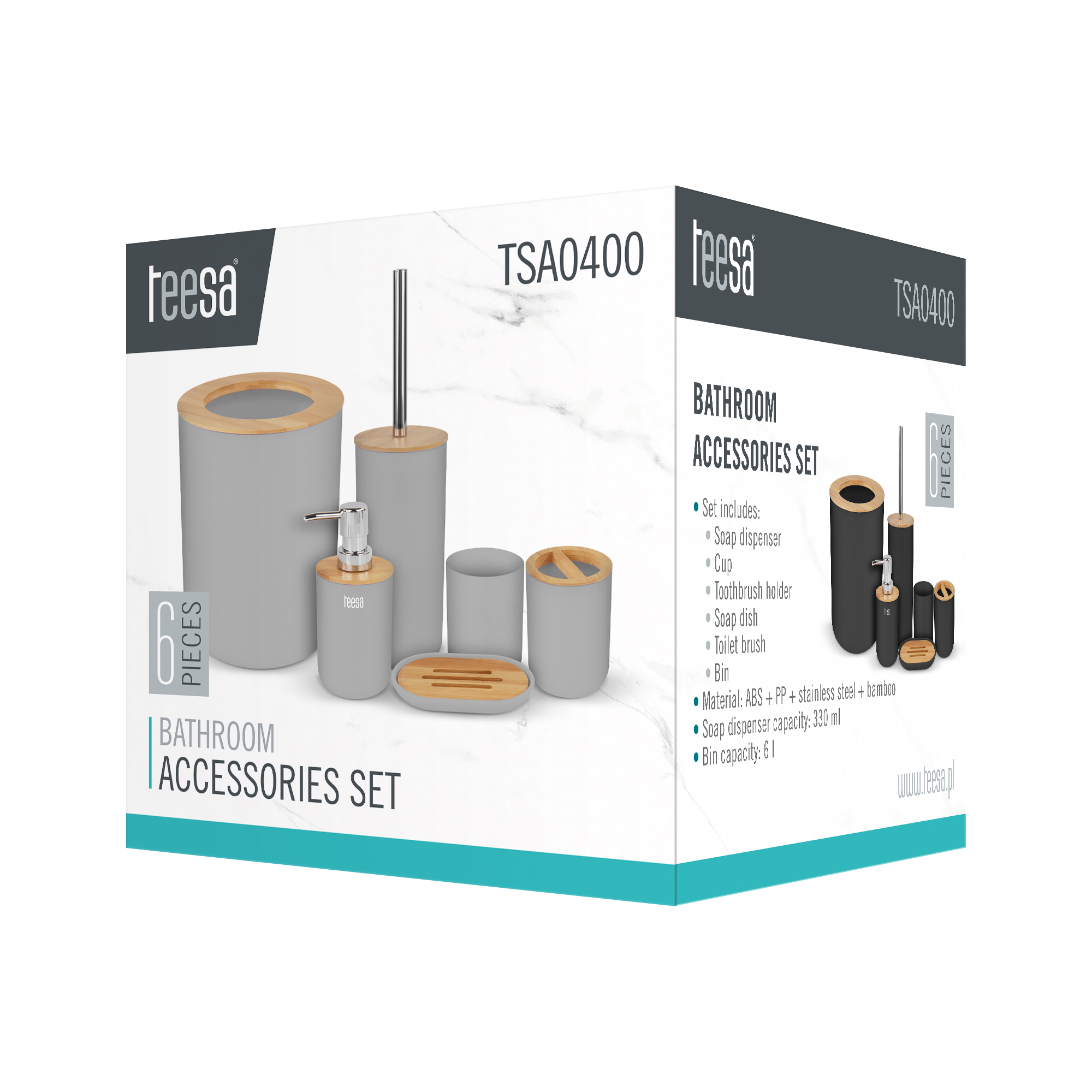 Rinkinį sudaro: muilo dozatorius, vonios taurelė, dantų šepetėlis, muilas, tualetinis šepetys, šiukšlių krepšys Medžiaga: ABS + PP + nerūdijančio plieno + bambuko Spalva: pilka + bambuko muilo dozatorius talpa: 330 ml Krepšelio talpa: 6 l Matmenys / svorio dozatorius: 7,5 x 7,5 x 16.5 mm / 75 g Matmenys / svorio puodelis: 7,5 x 7,5 x 10.3 mm / 33 g Matmenys / svoris dantų šepetėlio puodelis: 7,4 x 7,4 x 11,3 mm / 46 g Matmenys / svorio muilo dėžutė: 13.6 x 8,5 x 1,8 mm / 51 g Išmatavimai / svorio šepetys tualetui: 10 x 10 x 38,3 mm / 242 g Matmenys / svorio
