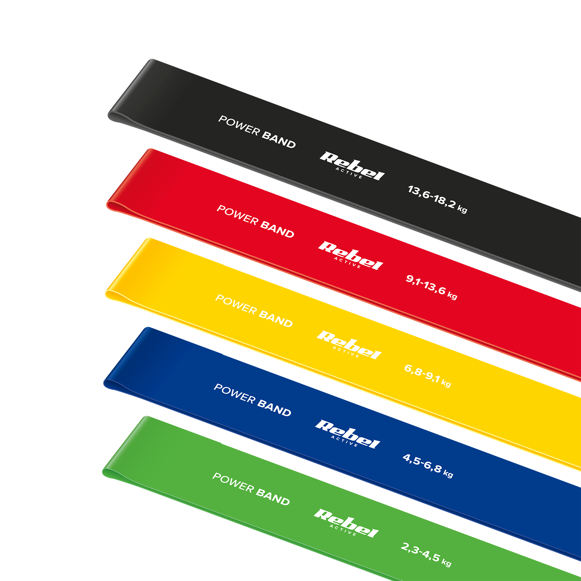 Medžiaga: latekso ilgis: 30 cm (apskritas: 60 cm) plotis: 50 mm Generuotas atsparumas ir storis: • Žalia: 2.3 - 4.5 kg, 0,35 mm • Mėlyna: 4.5 - 6.8 kg, 0,5 mm • geltona: 6.8 - 9,1 kg, 0,7 mm • Raudona: 9,1 - 13,6 kg, 0,9 mm • Juoda: 13,6 - 18,2 kg, 1,1 mm 5 vienetų komplekto viršelyje