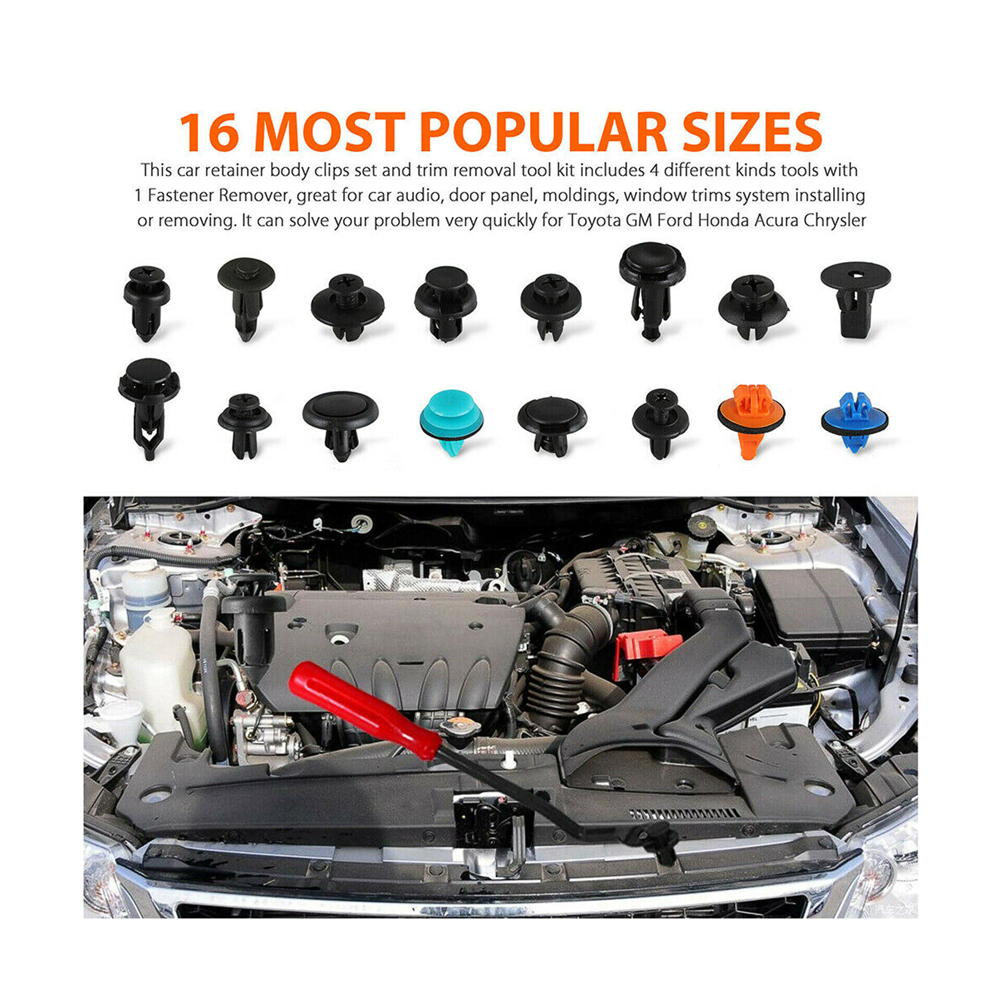 635 automobilių smeigtukai ir pašalinimo įrankiai rinkinys. plačiai naudojamas automobilių kaip montavimo elementų. Aukštos kokybės, patvari PVC medžiaga užtikrina ilgaamžiškumą. Prekių skaičius 635 plius išmontavimo įrankiai. Konteineryje su rankena atskirti komponentai. 635 vnt. Automobilių apkabos. 16 iš populiariausių dydžių: tai klipų rinkinys už automobilio kūno ir įrankių rinkinys pašalinti apmušalų. Ilga medžiaga: pašalinimo įrankiai ir klipai, pagaminti iš patvarios nailono medžiagos, yra ilgalaikio tarnavimo garantija. Rinkinys apima: 635 x klipai 4 x nailono įrankiai automatinio pjovimo pašalinimo. 1 x tvirtinimo įtaisas. 5 x juostelės